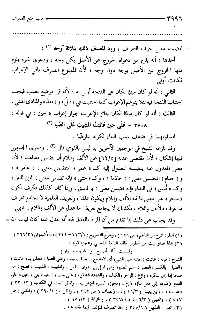وقد نازعه الشيخ في الوجهين الآخرين بما ليس بالقوي قال (¬3): ودعوى الجمهور فيها إشكال؛ لأن مقتضى عدله [5/ 62] عن الألف واللام أن يضمن معناهما؛ لأن معنى المعدول عنه يتضمنه المعدول إليه كـ «عمر» المتضمن معنى: «عامر»، و «حذام» المتضمن معنى: «حاذمة»، وك «مثنى» فإنه تضمن معنى: اثنين اثنين، وك «فسق» في النداء فإنه تضمن معنى: يا فاسق، وإذا كان كذلك فكيف يكون «سحر» على معنى ما فيه الألف واللام ويكون علما، وتعريف العلمية لا يجامع تعريف ما عرف بالألف واللام، فكذلك لا يجامع تعريف ما عدل عن الألف واللام. انتهى.