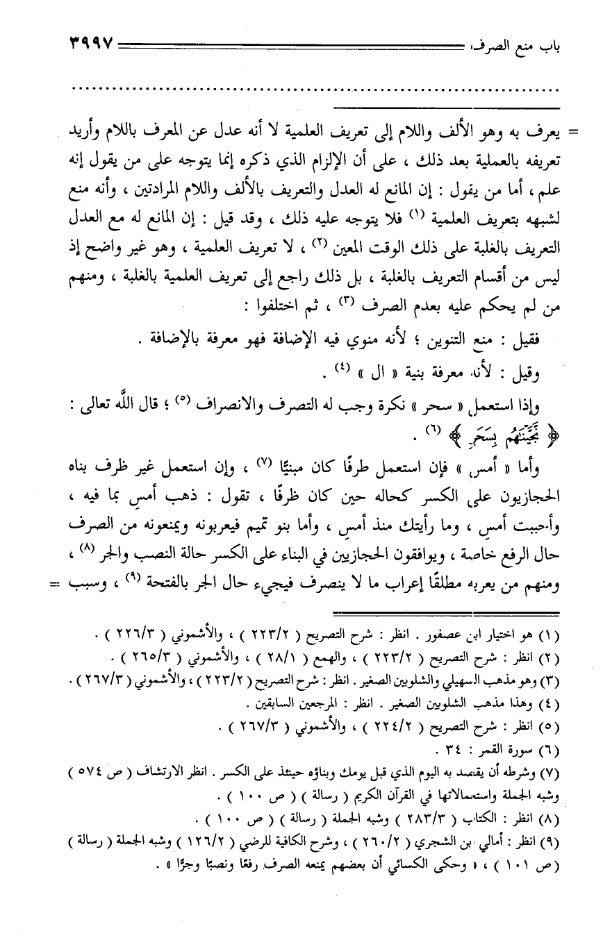 يعرف به وهو الألف واللام إلى تعريف العلمية لا أنه عدل عن المعرف باللام وأريد تعريفه بالعملية بعد ذلك، على أن الإلزام الذي ذكره إنما يتوجه على من يقول إنه علم، أما من يقول: إن المانع له العدل والتعريف بالألف واللام المرادتين، وأنه منع لشبهه بتعريف العلمية (¬1) فلا يتوجه عليه ذلك، وقد قيل: إن المانع له مع العدل التعريف بالغلبة على ذلك الوقت المعين (¬2)، لا تعريف العلمية، وهو غير واضح إذ ليس من أقسام التعريف بالغلبة، بل ذلك راجع إلى تعريف العلمية بالغلبة، ومنهم من لم يحكم عليه بعدم الصرف (¬3)، ثم اختلفوا: