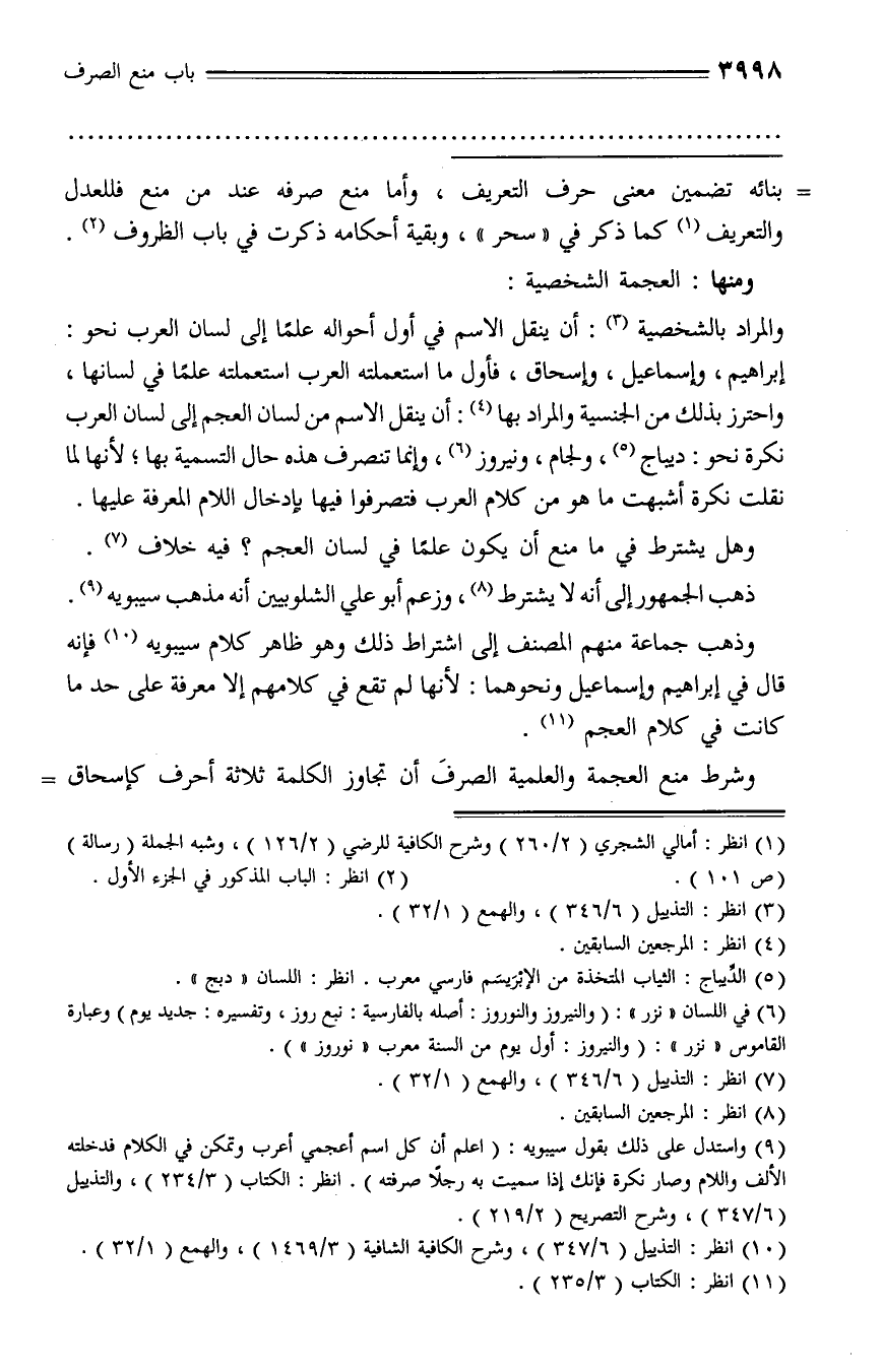 (¬9) واستدل على ذلك بقول سيبويه: (اعلم أن كل اسم أعجمي أعرب وتمكن في الكلام فدخلته الألف واللام وصار نكرة فإنك إذا سميت به رجلا صرفته). انظر: الكتاب (3/ 234)، والتذييل (6/ 347)، وشرح التصريح (2/ 219).