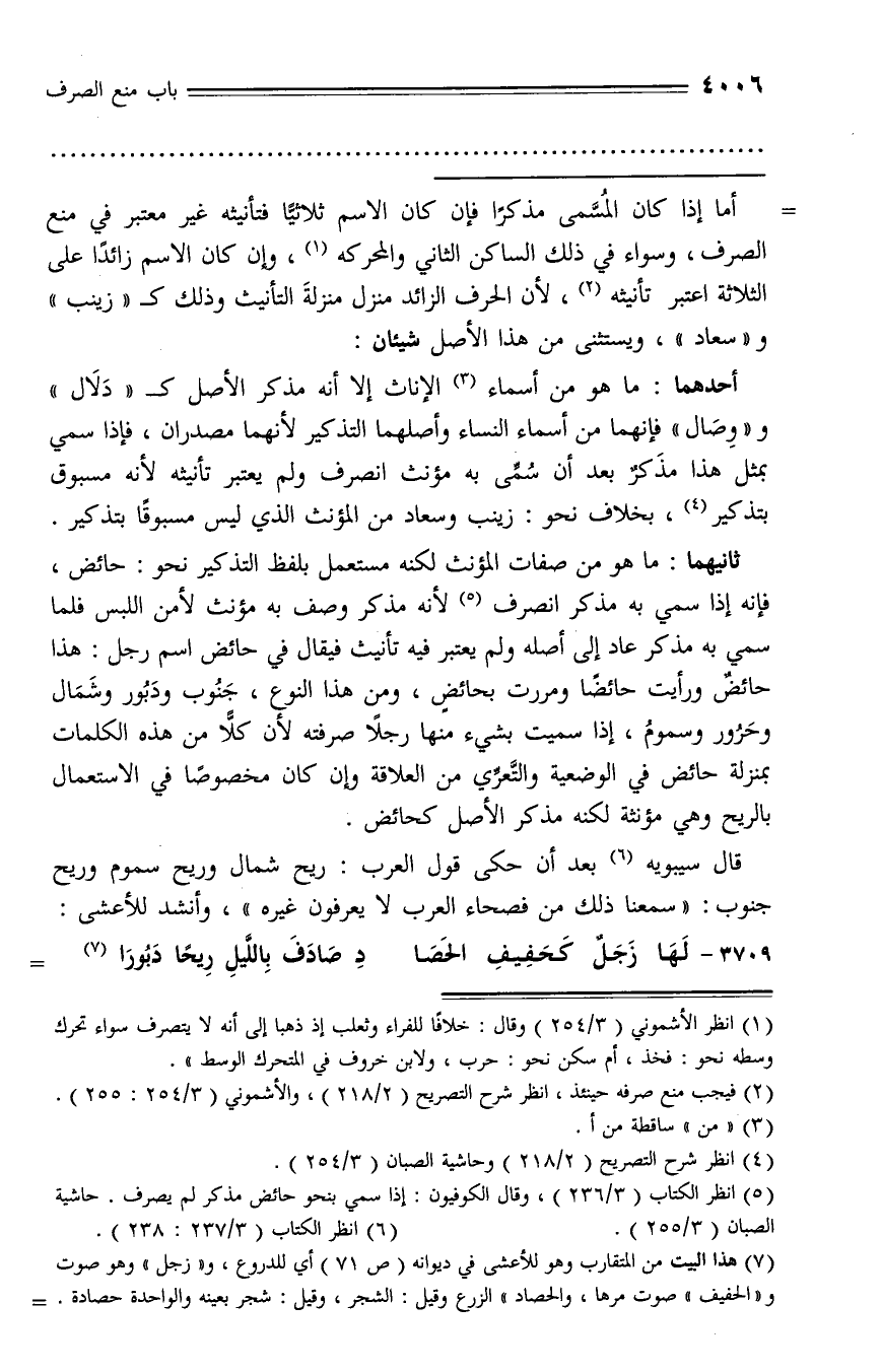 (¬5) انظر الكتاب (3/ 236)، وقال الكوفيون: إذا سمي بنحو حائض مذكر لم يصرف. حاشية الصبان (3/ 255).