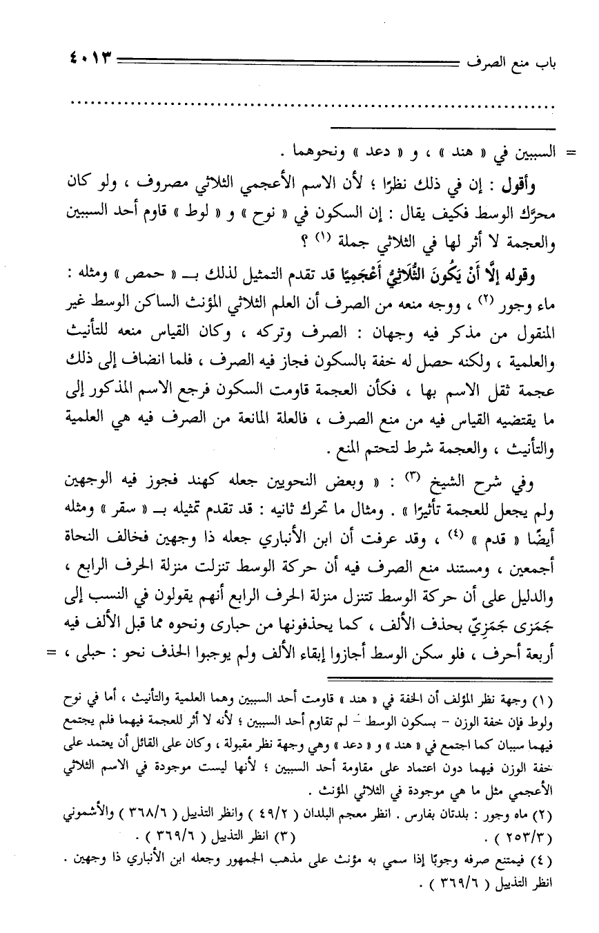 (¬1) وجهة نظر المؤلف أن الخفة في «هند» قاومت أحد السببين وهما العلمية والتأنيث، أما في نوح ولوط فإن خفة الوزن - بسكون الوسط - لم تقاوم أحد السببين؛ لأنه لا أثر للعجمة فيهما فلم يجتمع فيهما سببان كما اجتمع في «هند» و «دعد» وهي وجهة نظر مقبولة، وكان على القائل أن يعتمد على خفة الوزن فيهما دون اعتماد على مقاومة أحد السببين؛ لأنها ليست موجودة في الاسم الثلاثي الأعجمي مثل ما هي موجودة في الثلاثي المؤنث.
