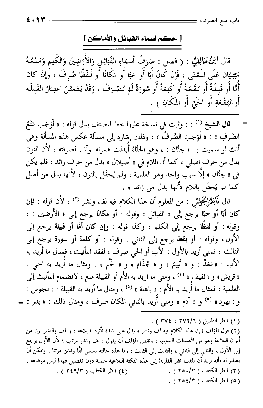 قال ابن مالك: (فصل: صرف أسماء القبائل والأرضين والكلم ومنعه مبنيّان على المعنى، فإن كان أبا أو حيّا أو مكانا أو لفظا صرف، وإن كان أمّا أو قبيلة أو بقعة أو كلمة أو سورة لم يصرف، وقد يتعيّن اعتبار القبيلة أو البقعة أو الحيّ أو المكان).