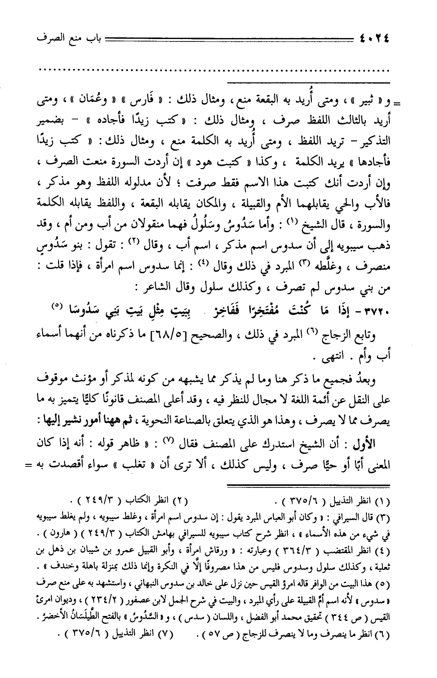 (¬3) قال السيرافي: «وكان أبو العباس المبرد يقول: إن سدوس اسم امرأة، وغلط سيبويه، ولم يغلط سيبويه في شيء من هذه الأسماء»، انظر شرح كتاب سيبويه للسيرافي بهامش الكتاب (3/ 249) (هارون).