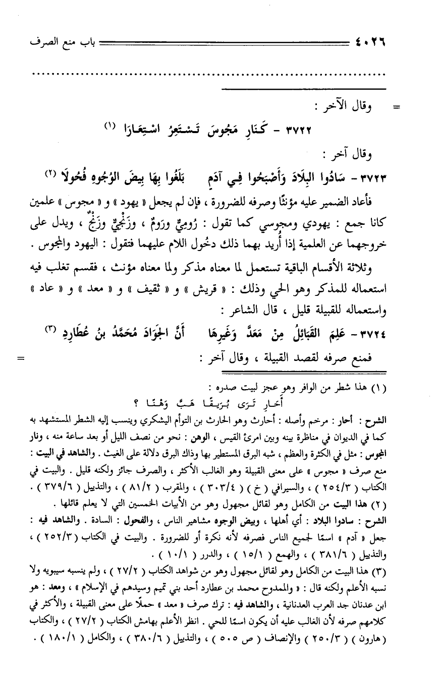 فأعاد الضمير عليه مؤنثا وصرفه للضرورة، فإن لم يجعل «يهود» و «مجوس» علمين كانا جمع. يهودي ومجوسي كما تقول: روميّ وروم، وزنجيّ وزنج، ويدل على خروجهما عن العلمية إذا أريد بهما ذلك دخول اللام عليهما فتقول: اليهود والمجوس.