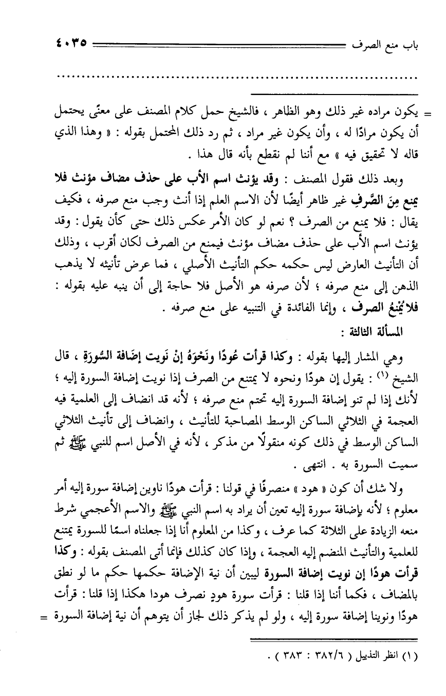 ولا شك أن كون «هود» منصرفا في قولنا: قرأت هودا ناوين إضافة سورة إليه أمر معلوم؛ لأنه بإضافة سورة إليه تعين أن يراد به اسم النبي صلّى الله عليه وسلّم والاسم الأعجمي شرط منعه الزيادة على الثلاثة كما عرف، وكذا من المعلوم أنا إذا جعلناه اسما للسورة يمتنع للعلمية والتأنيث المنضم إليه العجمة، وإذا كان كذلك فإنما أتى المصنف بقوله: وكذا قرأت هودا إن نويت إضافة السورة ليبين أن نية الإضافة حكمها حكم ما لو نطق بالمضاف، فكما أننا إذا قلنا: قرأت سورة هود نصرف هودا هكذا إذا قلنا: قرأت هودا ونوينا إضافة سورة إليه، ولو لم يذكر ذلك لجاز أن يتوهم أن نية إضافة السورة -
