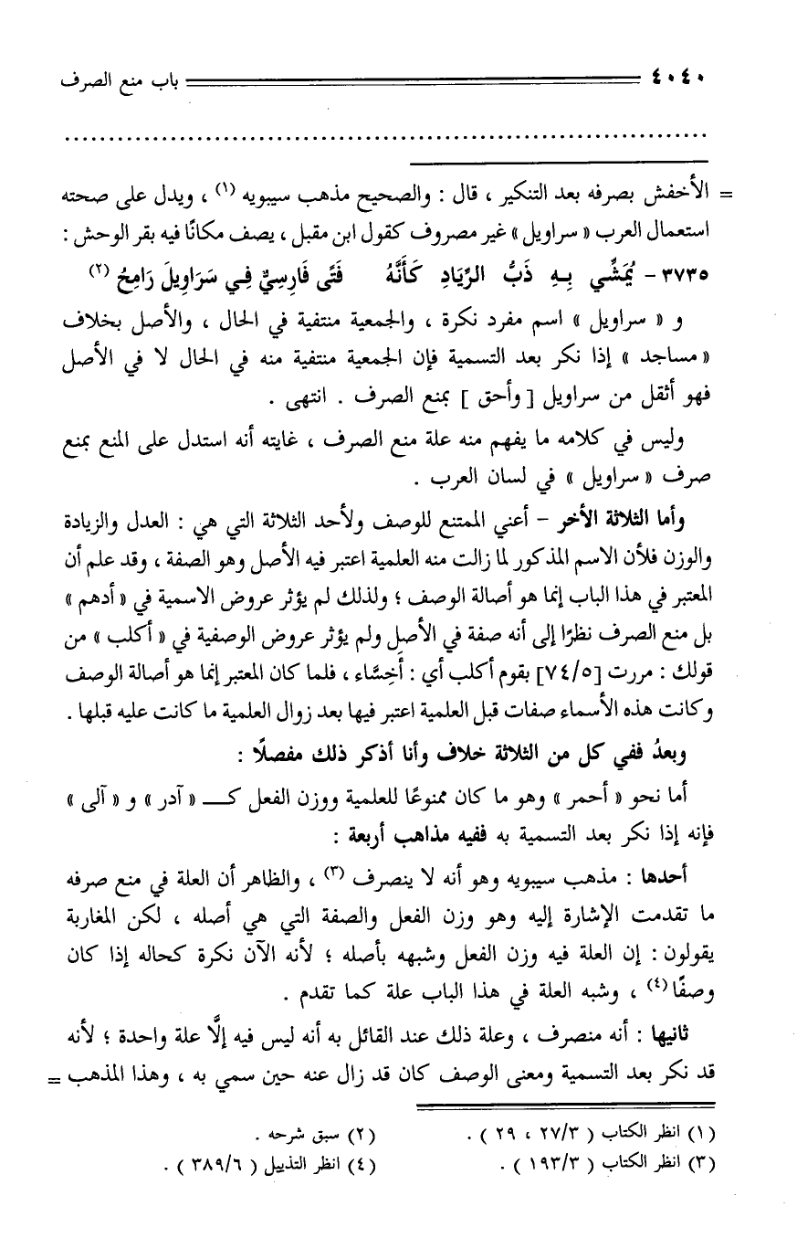وليس في كلامه ما يفهم منه علة منع الصرف، غايته أنه استدل على المنع بمنع صرف «سراويل» في لسان العرب.