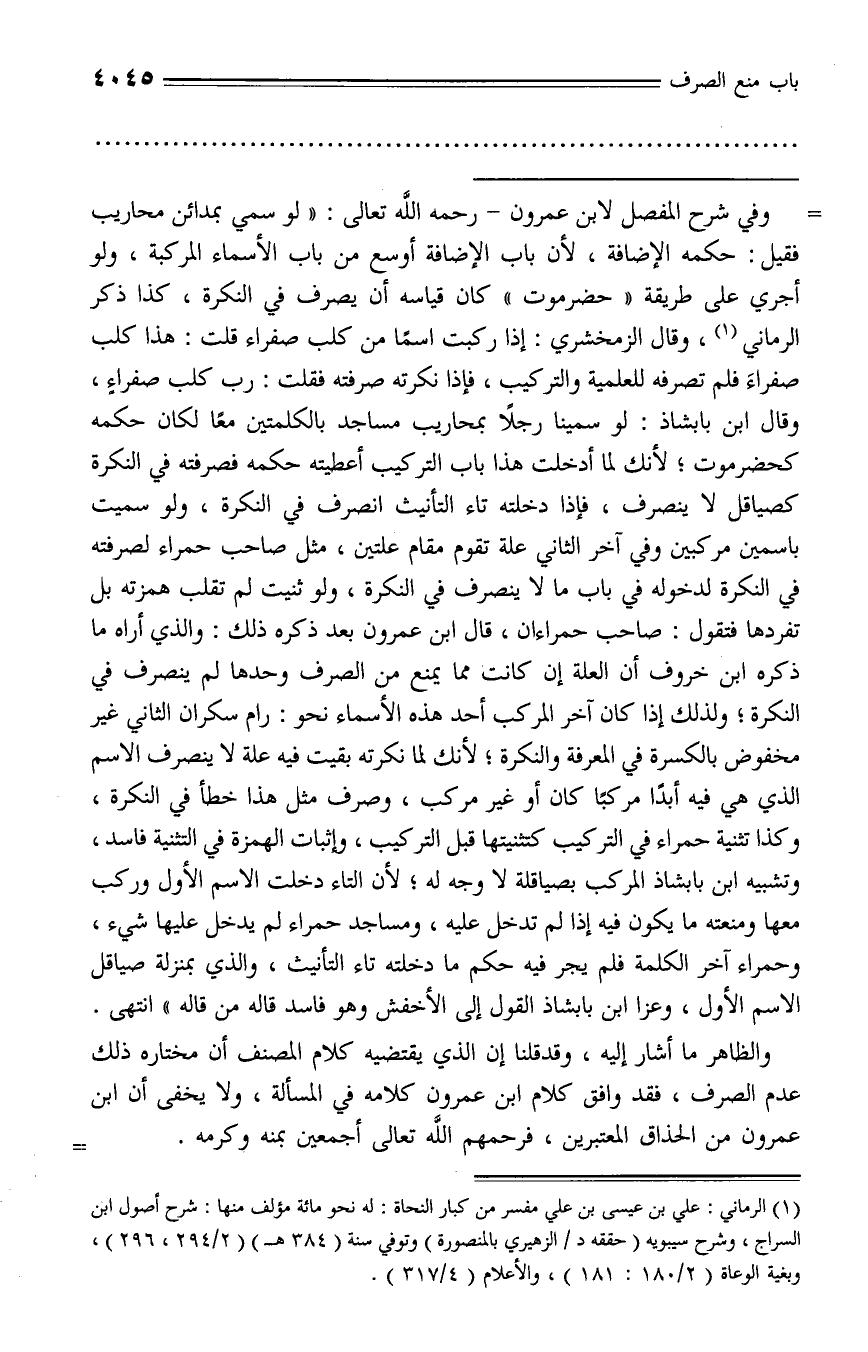 والظاهر ما أشار إليه، وقد قلنا إن الذي يقتضيه كلام المصنف أن مختاره ذلك عدم الصرف، فقد وافق كلام ابن عمرون كلامه في المسألة، ولا يخفى أن ابن عمرون من الحذاق المعتبرين، فرحمهم الله تعالى أجمعين بمنه وكرمه. -