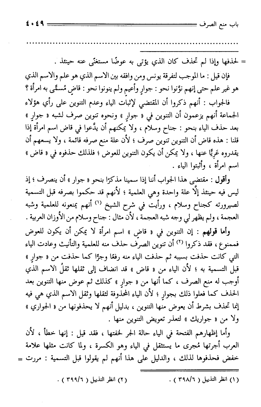 فالجواب: أنهم ذكروا أن المقتضي لإثبات الياء وعدم التنوين على رأي هؤلاء الجماعة أنهم يزعمون أن التنوين في «جوار» ونحوه تنوين صرف لشبه «جوار» بعد حذف الياء بنحو: جناح وسلام، ولا يمكنهم أن يدّعوا في قاض اسم امرأة إذا قلنا: هذه قاض أن التنوين تنوين صرف؛ لأن علة منع صرفه قائمة، ولا يسعهم أن يقدروه عريّا عنها، ولا يمكن أن يكون التنوين للعوض؛ فلذلك حذفوه في «قاض» اسم امرأة، وأثبتوا الياء.