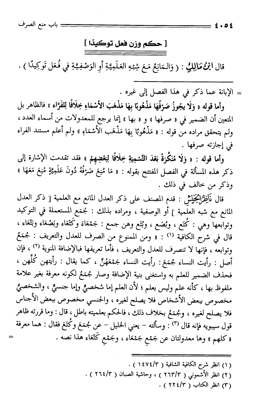 قال ناظر الجيش: قدم المصنف على ذكر العدل المانع مع العلمية [ذكر العدل المانع مع شبه العلمية] أو الوصفية، ومراده بذلك: جمع المستعملة في التوكيد وتوابعها وهي: كتع، وبصع، وبتع وهن جمع: جمعاء وكتعاء وبصعاء وبتعاء، قال في شرح الكافية (¬1): «ومن الممنوع من الصرف للعدل والتعريف: جمع وتوابعه، فإنها لا تنصرف للعدل والتعريف، فأما تعريفها فبالإضافة المنوية (¬2)، فإن أصل: رأيت النساء جمع: رأيت النساء جمعهنّ، كما يقال: رأيتهن كلّهن، فحذف الضمير للعلم به واستغنى بنية الإضافة وصار جمع لكونه معرفة بغير علامة ملفوظ بها، كأنه علم وليس بعلم؛ لأن العلم إما شخصيّ وإما جنسيّ، والشخصيّ مخصوص ببعض الأشخاص فلا يصلح لغيره، والجنسي مخصوص ببعض الأجناس فلا يصلح لغيره، وجمع بخلاف ذلك، فالحكم بعلميته باطل، قال: وما قررته ظاهر قول سيبويه فإنه قال (¬3): وسألته - يعني الخليل - عن جمع وكتع فقال: هما معرفة «كلهم» وها معدولتان عن جمع جمعاء، وجمع كتعاء هذا نصه. -