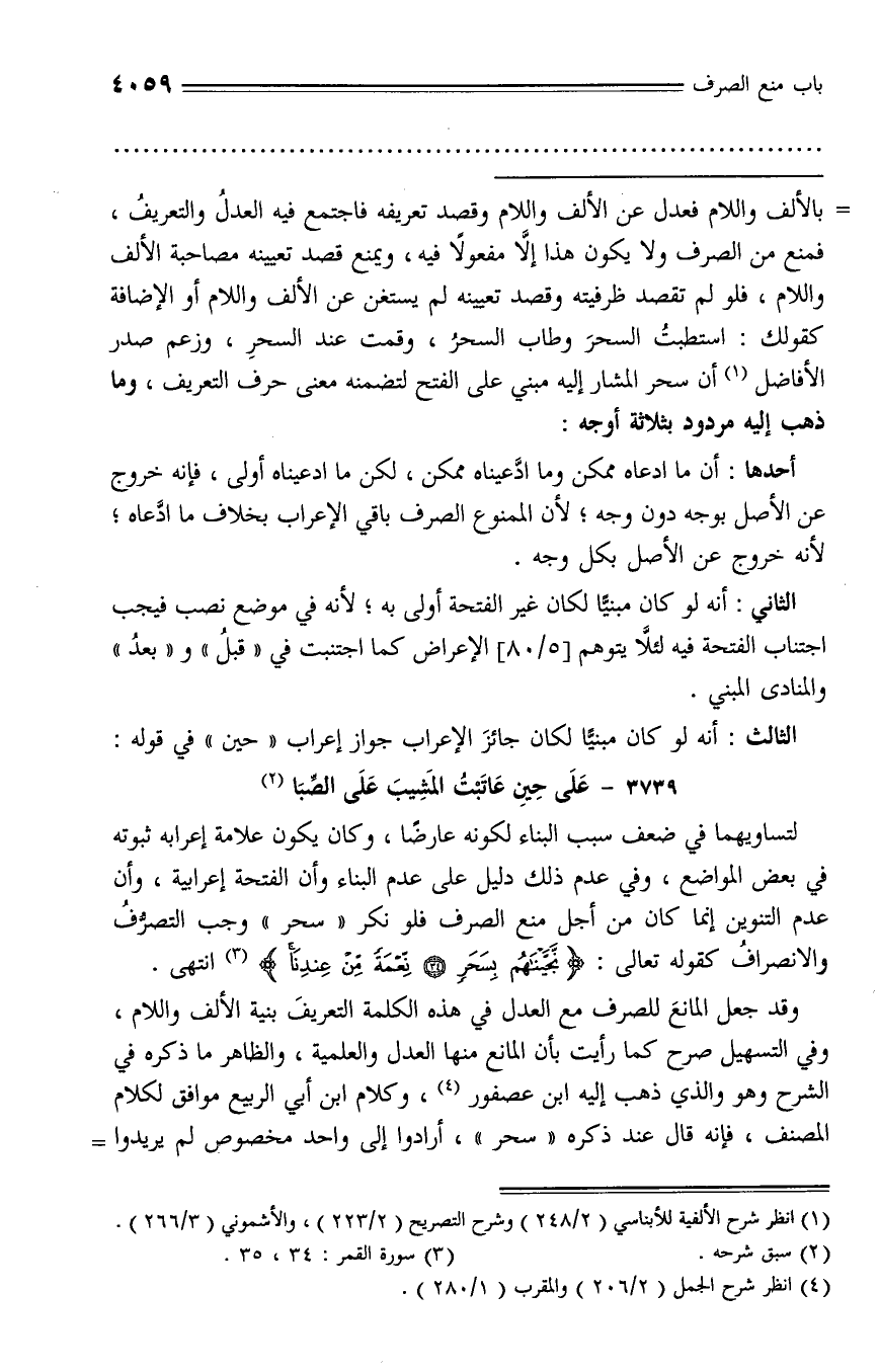 وقد جعل المانع للصرف مع العدل في هذه الكلمة التعريف بنية الألف واللام، وفي التسهيل صرح كما رأيت بأن المانع منها العدل والعلمية، والظاهر ما ذكره في الشرح وهو والذي ذهب إليه ابن عصفور (¬4)، وكلام ابن أبي الربيع موافق لكلام المصنف، فإنه قال عند ذكره «سحر»، أرادوا إلى واحد مخصوص لم يريدوا -