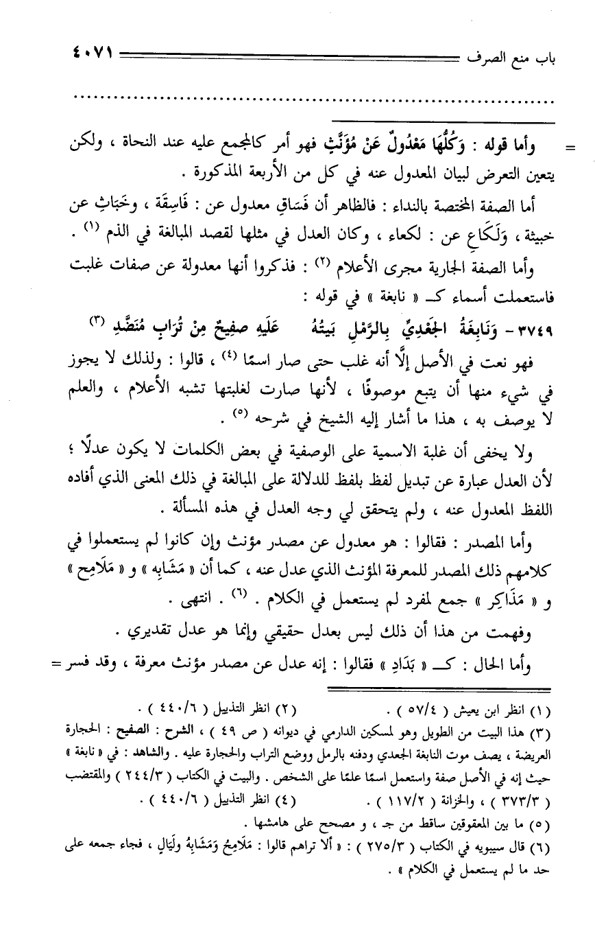 ولا يخفى أن غلبة الاسمية على الوصفية في بعض الكلمات لا يكون عدلا؛ لأن العدل عبارة عن تبديل لفظ بلفظ للدلالة على المبالغة في ذلك المعنى الذي أفاده اللفظ المعدول عنه، ولم يتحقق لي وجه العدل في هذه المسألة.