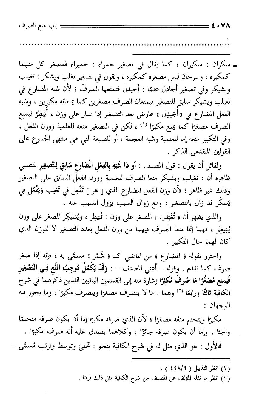 سكران: سكيران، كما يقال في تصغير حمراء: حميراء فمصغر كل منهما كمكبره، وسرحان ليس مصغره كمكبره، وتقول في تصغير تغلب ويشكر: تغيلب ويشيكر وفي تصغير أجادل علما: أجيدل فتمنعها الصرف؛ لأن شبه المضارع في تغيلب ويشيكر سابق للتصغير فيمنعان الصرف مصغرين كما يمنعانه مكبرين، وشبه الفعل المضارع في «أجيدل» عارض بعد التصغير إذا صار على وزن، أبيطر فيمنع الصرف مصغرا كما يمنع مكبرا (¬1)، لكن في التصغير منعه للعلمية ووزن الفعل، وفي التكبير منعه إما للعلمية وشبه العجمة، أو للصيغة التي هي منتهى الجموع على القولين المتقدمي الذكر.