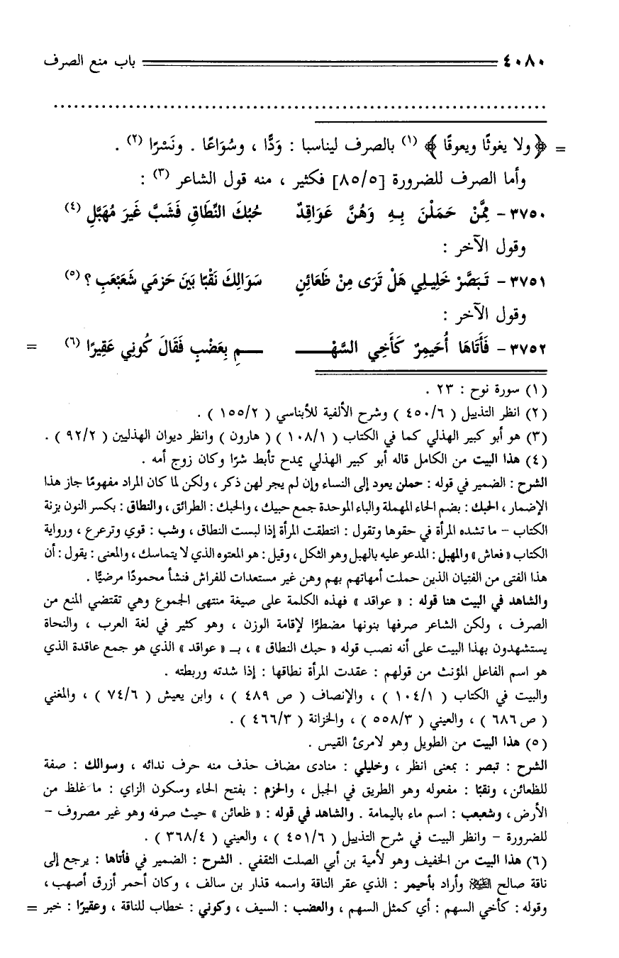 الشرح: تبصر: بمعنى انظر، وخليلي: منادى مضاف حذف منه حرف ندائه، وسوالك: صفة للظعائن، ونقبا: مفعوله وهو الطريق في الجبل، والحزم: بفتح الحاء وسكون الزاي: ما غلظ من الأرض، وشعبعب: اسم ماء باليمامة. والشاهد في قوله: «ظعائن» حيث صرفه وهو غير مصروف - للضرورة - وانظر البيت في شرح التذييل (6/ 451)، والعيني (4/ 368).