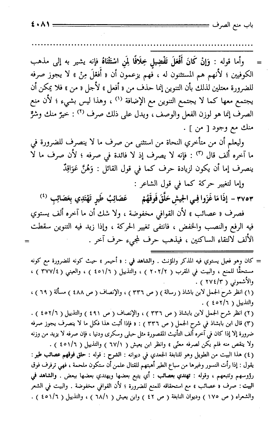 فصرف «عصائب» لأن القوافي مخفوضة، ولا شك أن ما آخره ألف يستوي فيه الرفع والنصب والخفض، فانتفى تغيير الحركة، وإذا زيد فيه التنوين سقطت الألف لالتقاء الساكنين، فيذهب حرف لمجيء حرف آخر. -