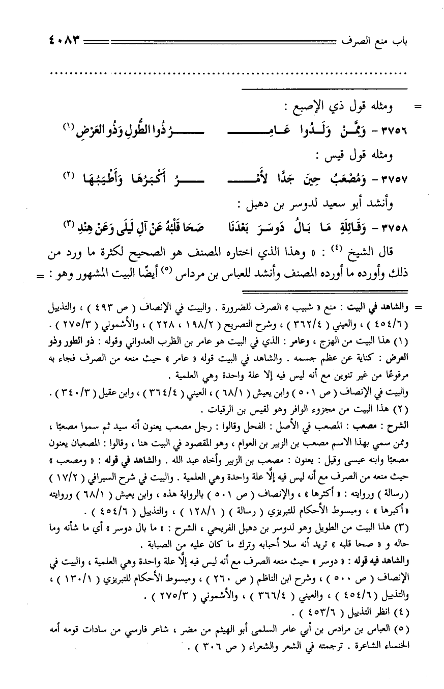 قال الشيخ (¬4): «وهذا الذي اختاره المصنف هو الصحيح لكثرة ما ورد من ذلك وأورده ما أورده المصنف وأنشد للعباس بن مرداس (¬5) أيضا البيت المشهور وهو: -