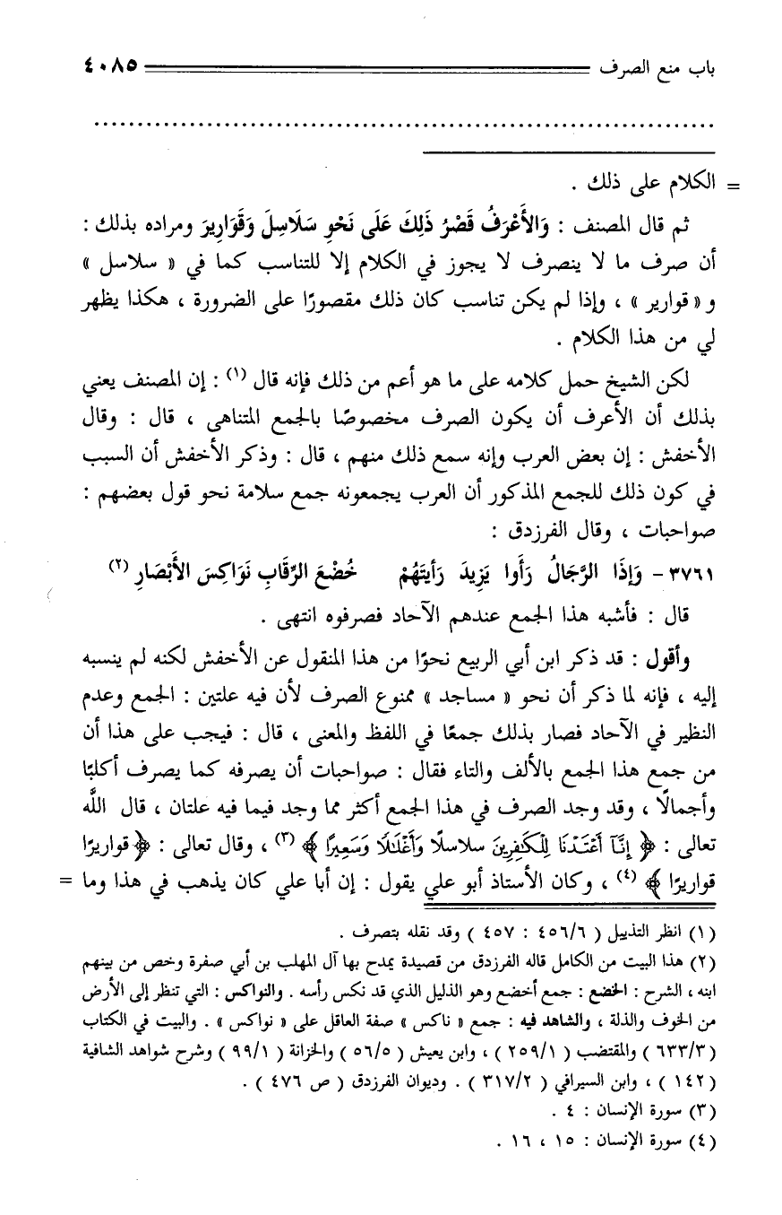 أن صرف ما لا ينصرف لا يجوز في الكلام إلا للتناسب كما في «سلاسل» و «قوارير»، وإذا لم يكن تناسب كان ذلك مقصورا على الضرورة، هكذا يظهر لي من هذا الكلام.