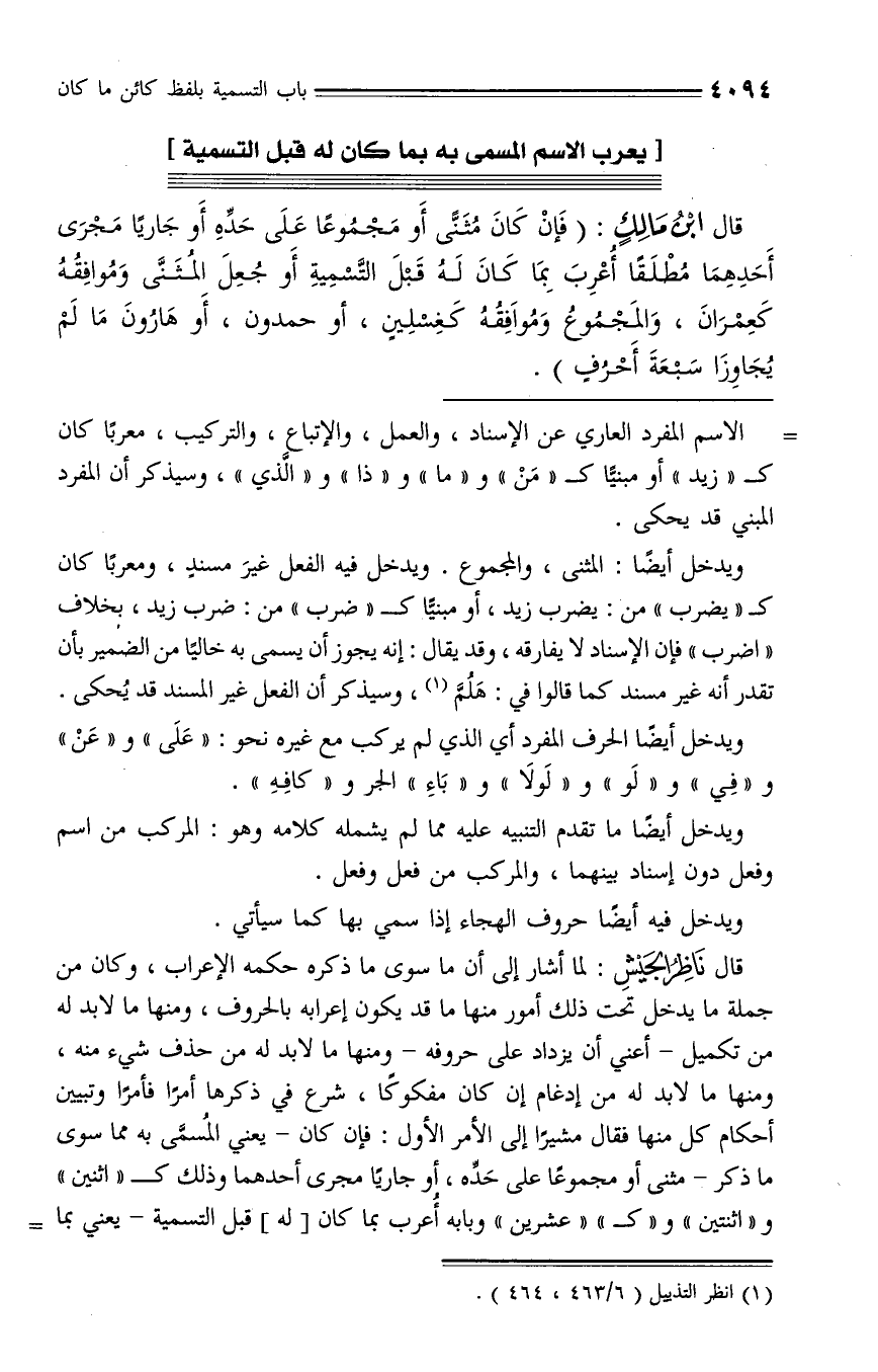 الاسم المفرد العاري عن الإسناد، والعمل، والإتباع، والتركيب، معربا كان كـ «زيد» أو مبنيّا كـ «من» و «ما» و «ذا» و «الّذي»، وسيذكر أن المفرد المبني قد يحكى.