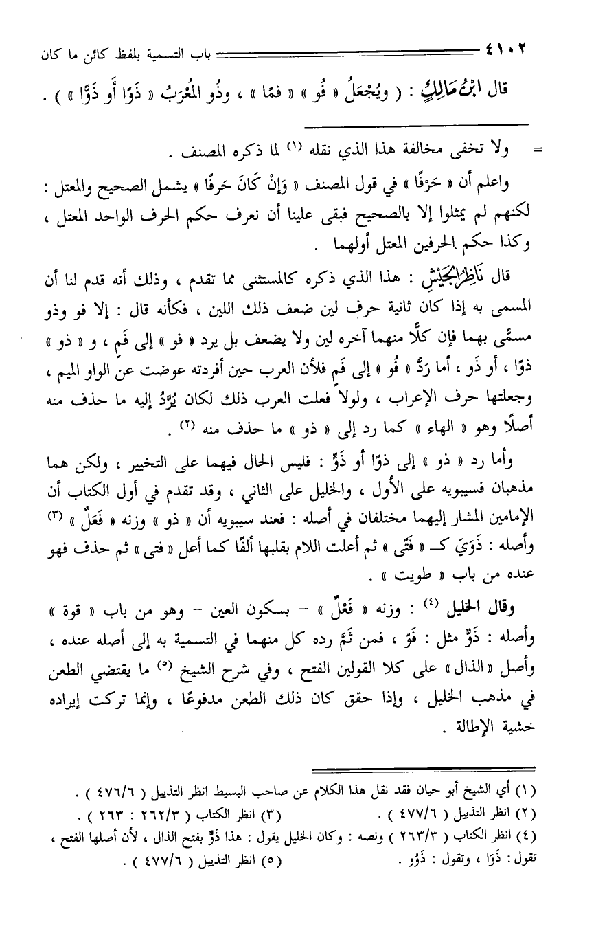 (¬4) انظر الكتاب (3/ 263) ونصه: وكان الخليل يقول: هذا ذوّ بفتح الذال، لأن أصلها الفتح، تقول: ذوا، وتقول: ذوو.