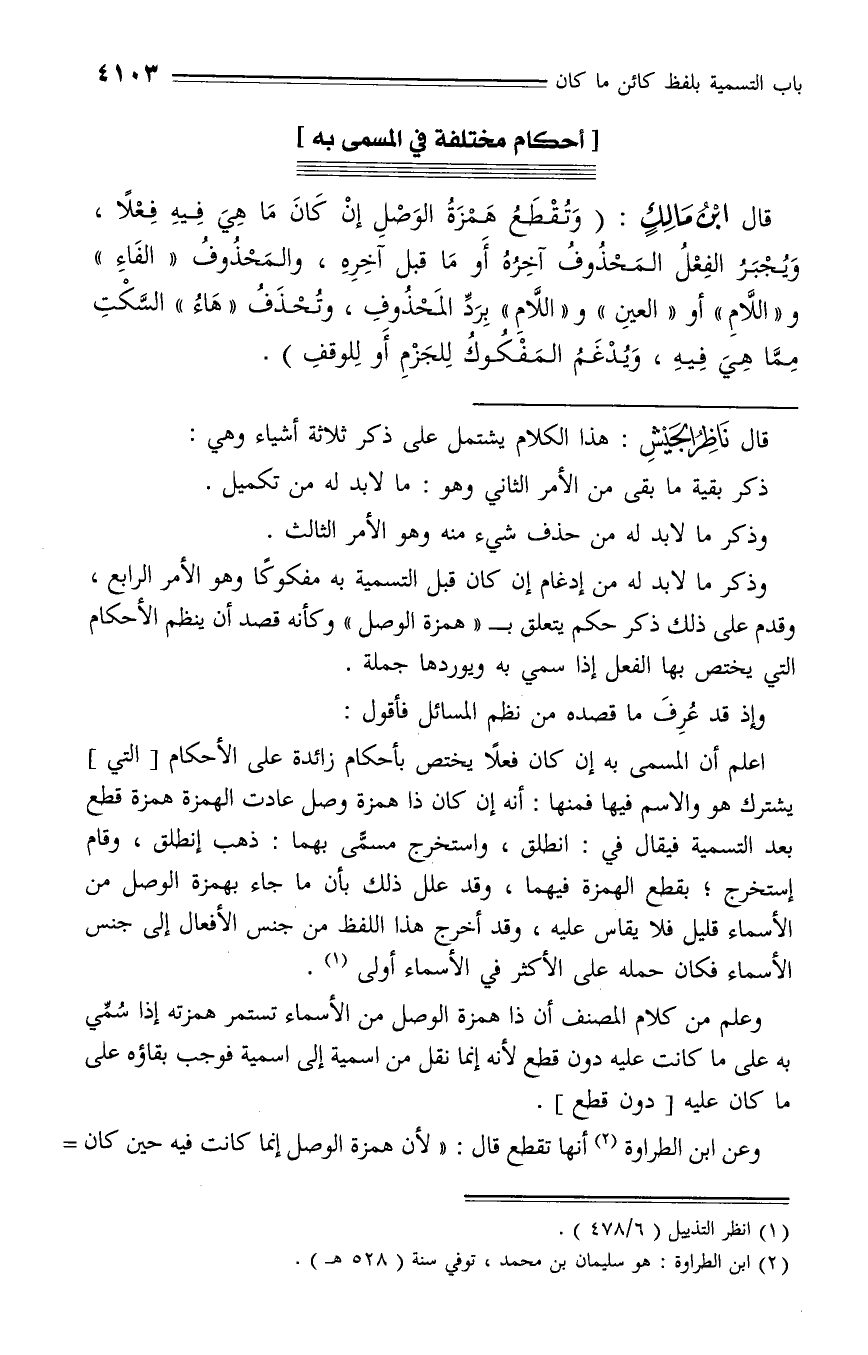 اعلم أن المسمى به إن كان فعلا يختص بأحكام زائدة على الأحكام [التي] يشترك هو والاسم فيها فمنها: أنه إن كان ذا همزة وصل عادت الهمزة همزة قطع بعد التسمية فيقال في: انطلق، واستخرج مسمّى بهما: ذهب إنطلق،
