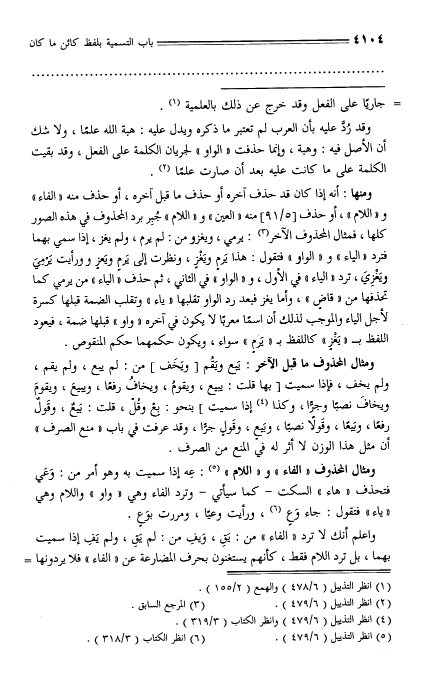 واعلم أنك لا ترد «الفاء» من: يق، ويف من: لم يق، ولم يف إذا سميت بهما، بل ترد اللام فقط، كأنهم يستغنون بحرف المضارعة عن «الفاء» فلا يردونها -