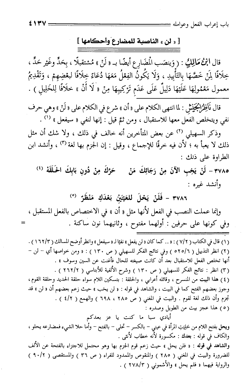 قال ابن مالك: (وينصب المضارع أيضا بـ «لن» مستقبلا، بحدّ وغير حدّ، خلافا لمن خصّها بالتأبيد، ولا يكون الفعل معها دعاء خلافا لبعضهم، وتقديم معمول معمولها عليها دليل على عدم تركيبها من «لا أن» خلافا للخليل).