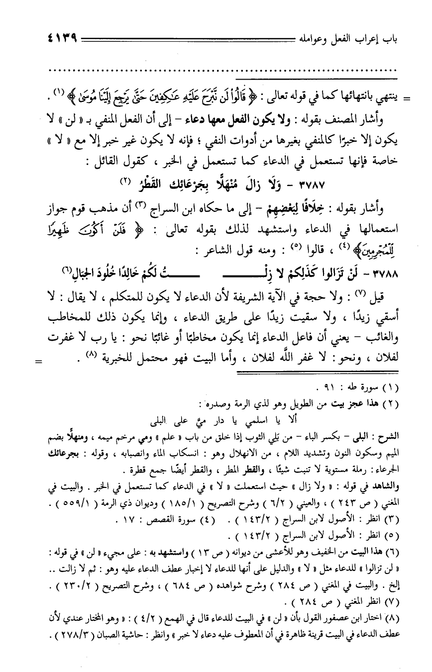 (¬8) اختار ابن عصفور القول بأن «لن» في البيت للدعاء قال في الهمع (2/ 4): «وهو المختار عندي لأن عطف الدعاء في البيت قرينة ظاهرة في أن المعطوف عليه دعاء لا خبر» وانظر: حاشية الصبان (3/ 278).