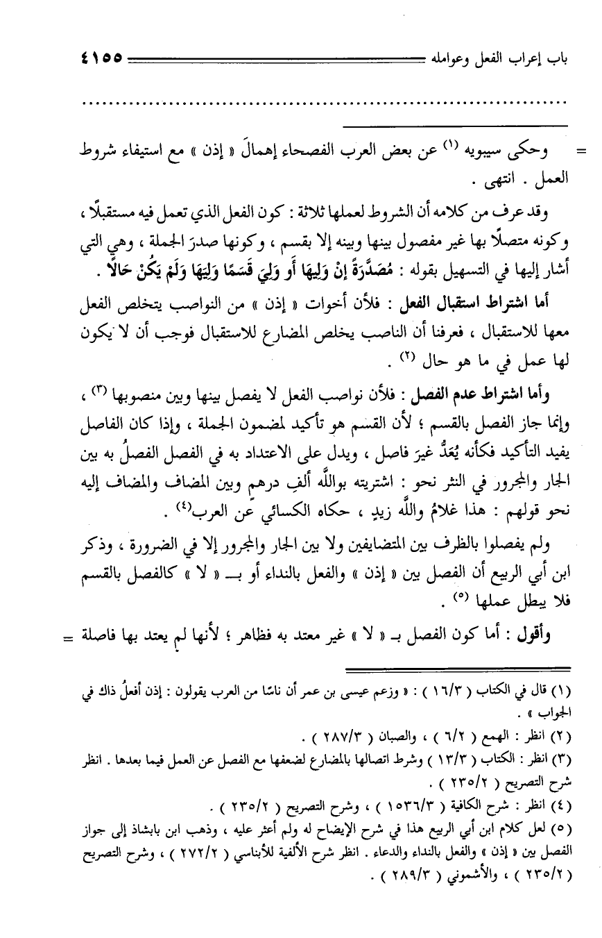 (¬5) لعل كلام ابن أبي الربيع هذا في شرح الإيضاح له ولم أعثر عليه، وذهب ابن بابشاذ إلى جواز الفصل بين «إذن» والفعل بالنداء والدعاء. انظر شرح الألفية للأبناسي (2/ 272)، وشرح التصريح (2/ 235)، والأشموني (3/ 289).