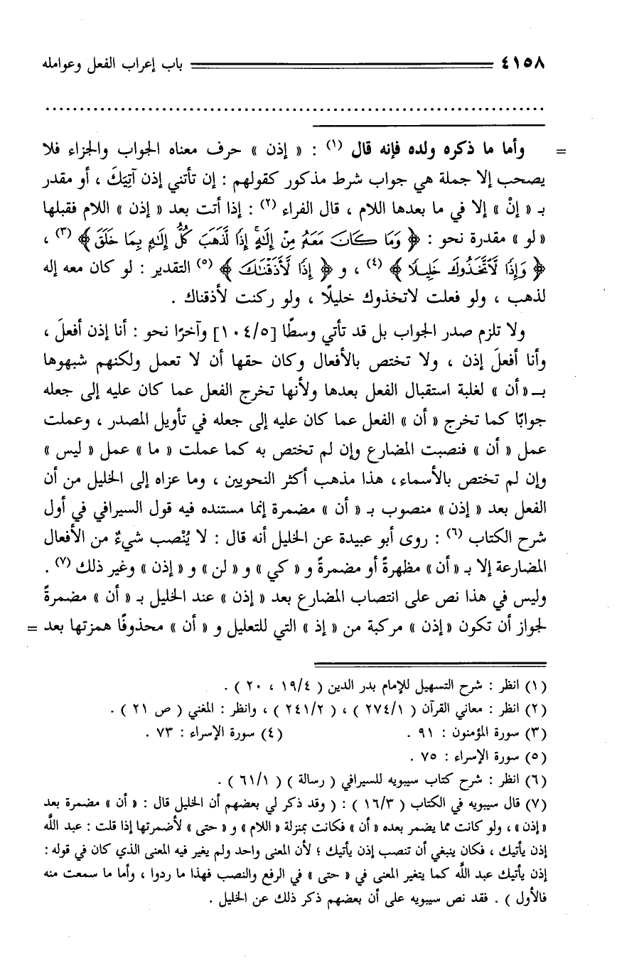 (¬7) قال سيبويه في الكتاب (3/ 16): (وقد ذكر لي بعضهم أن الخليل قال: «أن» مضمرة بعد «إذن»، ولو كانت مما يضمر بعده «أن» فكانت بمنزلة «اللام» و «حتى» لأضمرتها إذا قلت: عبد الله إذن يأتيك، فكان ينبغي أن تنصب إذن يأتيك؛ لأن المعنى واحد ولم يغير فيه المعنى الذي كان في قوله: