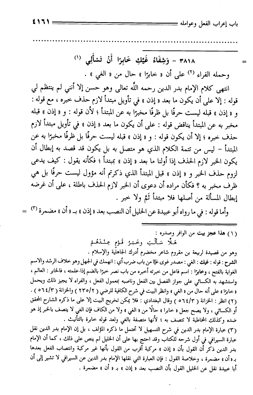 (¬3) عبارة الإمام بدر الدين في شرح التسهيل لا تحتمل ما ذكره المؤلف، بل إن الإمام بدر الدين نقل عبارة السيرافي في أول شرحه للكتاب وقد احتج بها على أن الخليل لم ينص على ذلك، كما أن الإمام بدر الدين ذكر أن القول بأن «إذن» مركبة أقرب من القول بأنها غير مركبة وانتصاب الفعل بعدها بـ «أن» مضمرة، وخلاصة القول: فإن العبارة التي نقلها الإمام بدر الدين عن السيرافي لا تشير إلى أن أبا عبيدة نقل عن الخليل القول بأن النصب بعد «إذن» بـ «أن» مضمرة.