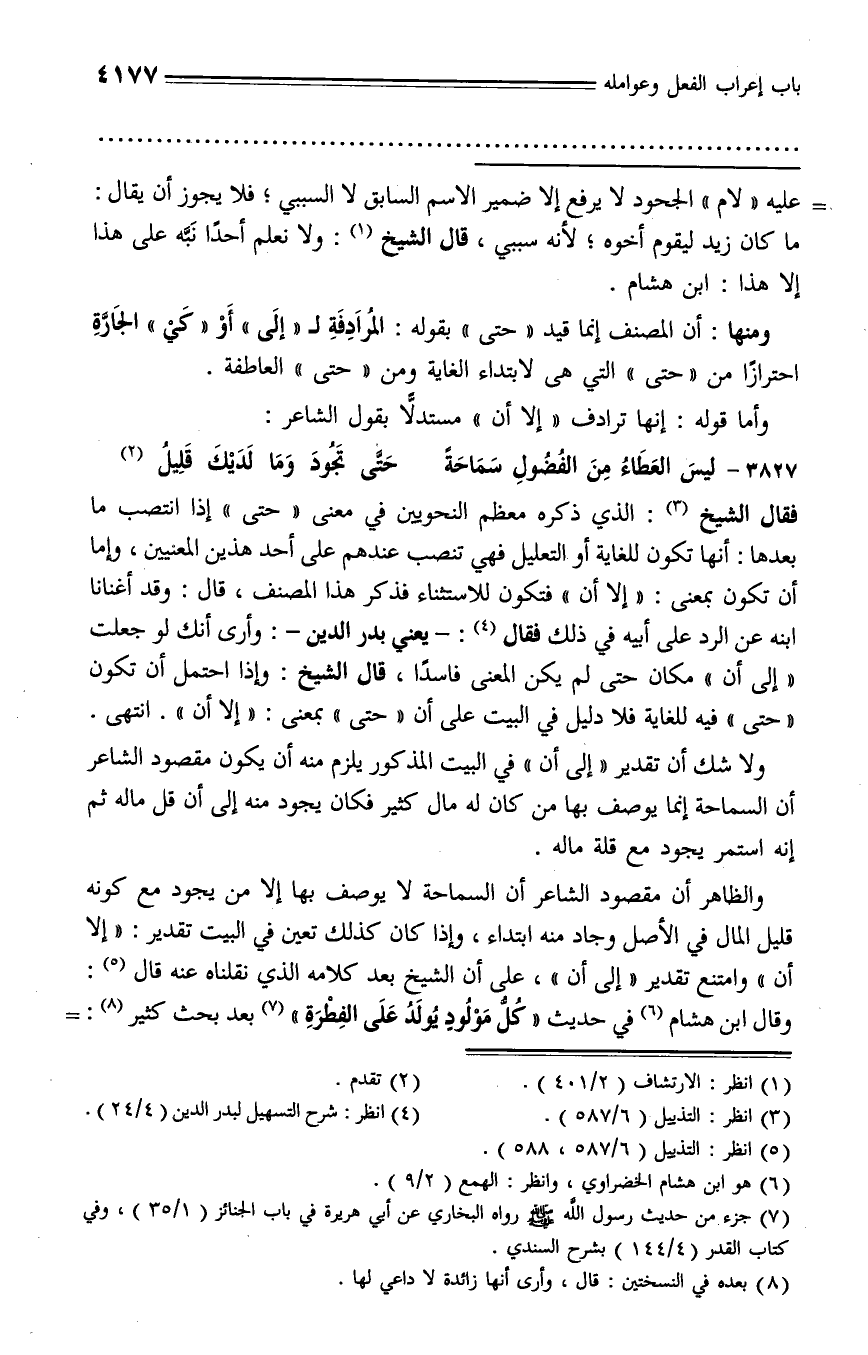 ولا شك أن تقدير «إلى أن» في البيت المذكور يلزم منه أن يكون مقصود الشاعر أن السماحة إنما يوصف بها من كان له مال كثير فكان يجود منه إلى أن قل ماله ثم إنه استمر يجود مع قلة ماله.