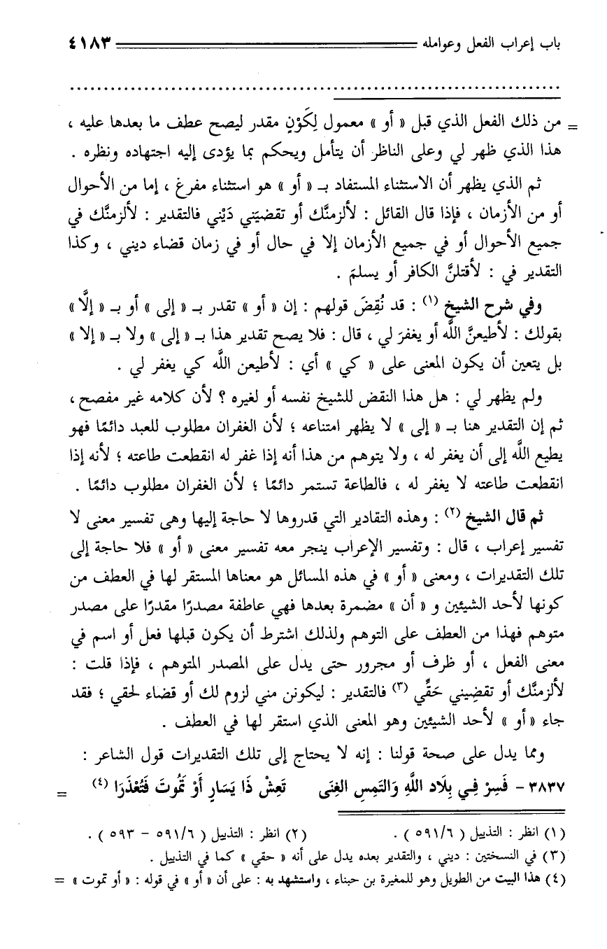 ثم الذي يظهر أن الاستثناء المستفاد بـ «أو» هو استثناء مفرغ، إما من الأحوال أو من الأزمان، فإذا قال القائل: لألزمنّك أو تقضيني ديني فالتقدير: لألزمنّك في جميع الأحوال أو في جميع الأزمان إلا في حال أو في زمان قضاء ديني، وكذا التقدير في: لأقتلنّ الكافر أو يسلم.