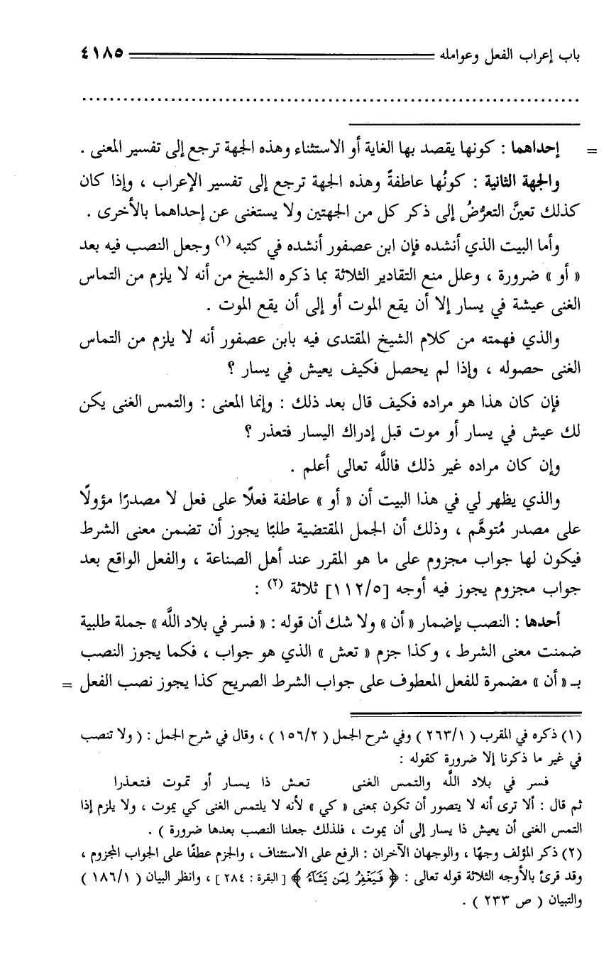 ثم قال: ألا ترى أنه لا يتصور أن تكون بمعنى «كي» لأنه لا يلتمس الغنى كي يموت، ولا يلزم إذا التمس الغنى أن يعيش ذا يسار إلى أن يموت، فلذلك جعلنا النصب بعدها ضرورة).