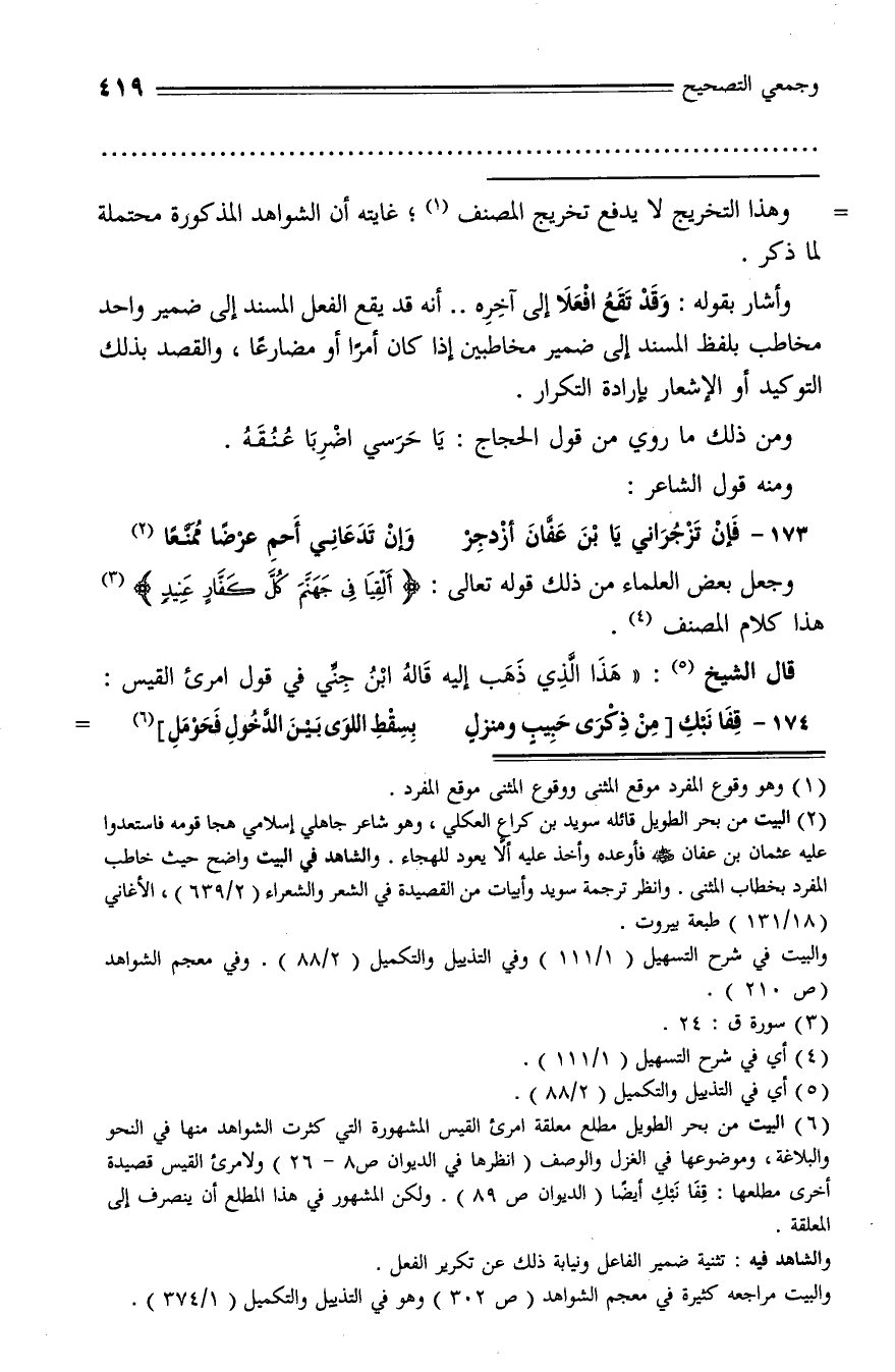 (¬2) البيت من بحر الطويل قائله سويد بن كراع العكلي، وهو شاعر جاهلي إسلامي هجا قومه فاستعدوا عليه عثمان بن عفان رضي الله عنه فأوعده وأخذ عليه ألّا يعود للهجاء. والشاهد في البيت واضح حيث خاطب المفرد بخطاب المثنى. وانظر ترجمة سويد وأبيات من القصيدة في الشعر والشعراء (2/ 639)، الأغاني (18/ 131) طبعة بيروت.