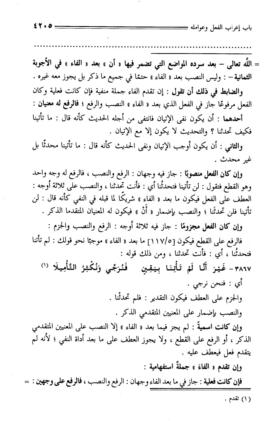 الله تعالى - بعد سرده المواضع التي تضمر فيها «أن» بعد «الفاء» في الأجوبة الثمانية -: وليس النصب بعد «الفاء» حتما في جميع ما ذكر بل يجوز معه غيره.