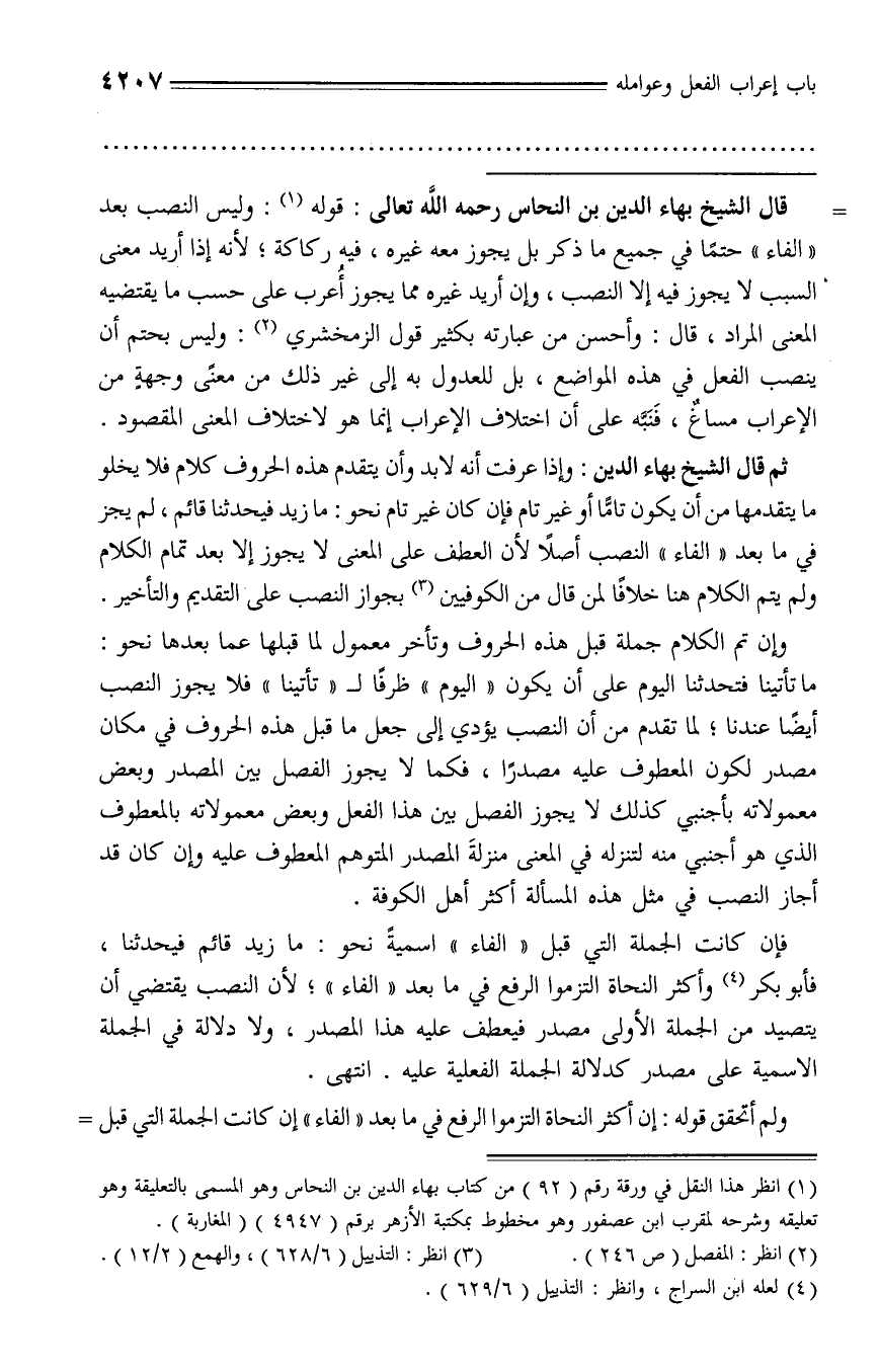 ثم قال الشيخ بهاء الدين: وإذا عرفت أنه لا بد وأن يتقدم هذه الحروف كلام فلا يخلو ما يتقدمها من أن يكون تامّا أو غير تام فإن كان غير تام نحو: ما زيد فيحدثنا قائم، لم يجز في ما بعد «الفاء» النصب أصلا لأن العطف على المعنى لا يجوز إلا بعد تمام الكلام ولم يتم الكلام هنا خلافا لمن قال من الكوفيين (¬3) بجواز النصب على التقديم والتأخير.