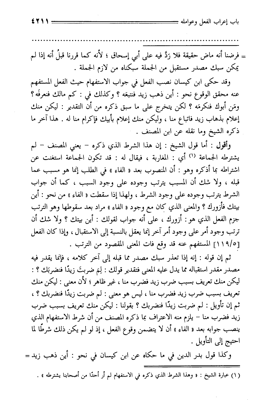وأقول: أما قول الشيخ: إن هذا الشرط الذي ذكره - يعني المصنف - لم يشترطه الجماعة (¬1) أي: المغاربة، فيقال له: قد تكون الجماعة استغنت عن اشتراطه بما أذكره وهو: أن المنصوب بعد «الفاء» في الطلب إنما هو مسبب عما قبله، ولا شك أن المسبب يترتب وجوده على وجود السبب، كما أن جواب الشرط يترتب وجوده على وجود الشرط، ولهذا إذا سقطت «الفاء» من نحو: أين بيتك فأزورك؟ والمعنى الذي كان مع وجود «الفاء» مراد بعد سقوطها وهو الترتب جزم الفعل الذي هو: أزورك، على أنه جواب لقولك: أين بيتك؟ ولا شك أن ترتب وجود أمر على وجود أمر آخر إنما يعقل بالنسبة إلى الاستقبال، وإذا كان الفعل [5/ 119] المستفهم عنه قد وقع فات المعنى المقصود من الترتب.