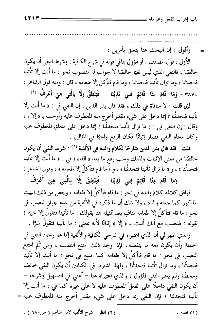 قلت: فقد قال بدر الدين شارحا لكلام والده في الألفية (¬2): شرط النفي أن يكون خالصا من معنى الإثبات ولذلك وجب رفع ما بعد «الفاء» في: «ما أنت إلا تأتينا فتحدثنا»، و «ما تزال تأتينا فتحدثنا»، و «ما قام فتأكل إلا طعامه»، وقول الشاعر:
