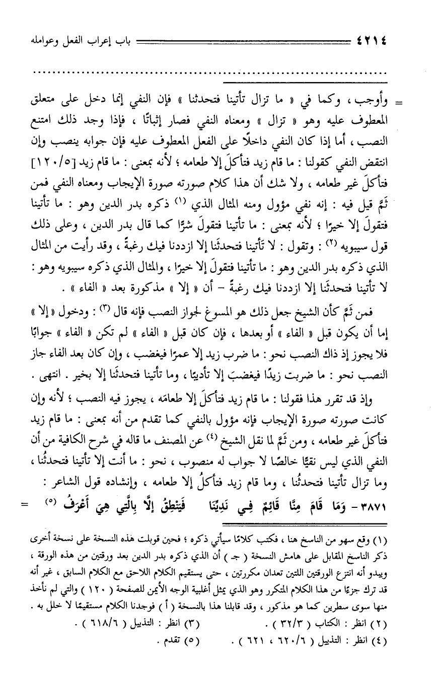 وأوجب، وكما في «ما تزال تأتينا فتحدثنا» فإن النفي إنما دخل على متعلق المعطوف عليه وهو «تزال» ومعناه النفي فصار إثباتا، فإذا وجد ذلك امتنع النصب، أما إذا كان النفي داخلا على الفعل المعطوف عليه فإن جوابه ينصب وإن انتقض النفي كقولنا: ما قام زيد فتأكل إلا طعامه؛ لأنه بمعنى: ما قام زيد [5/ 120] فتأكل غير طعامه، ولا شك أن هذا كلام صورته صورة الإيجاب ومعناه النفي فمن ثمّ قيل فيه: إنه نفي مؤول ومنه المثال الذي (¬1) ذكره بدر الدين وهو: ما تأتينا فتقول إلا خيرا؛ لأنه بمعنى: ما تأتينا فتقول شرّا كما قال بدر الدين، وعلى ذلك قول سيبويه (¬2): وتقول: لا تأتينا فتحدثنا إلا ازددنا فيك رغبة، وقد رأيت من المثال الذي ذكره بدر الدين وهو: ما تأتينا فتقول إلا خيرا، والمثال الذي ذكره سيبويه وهو: