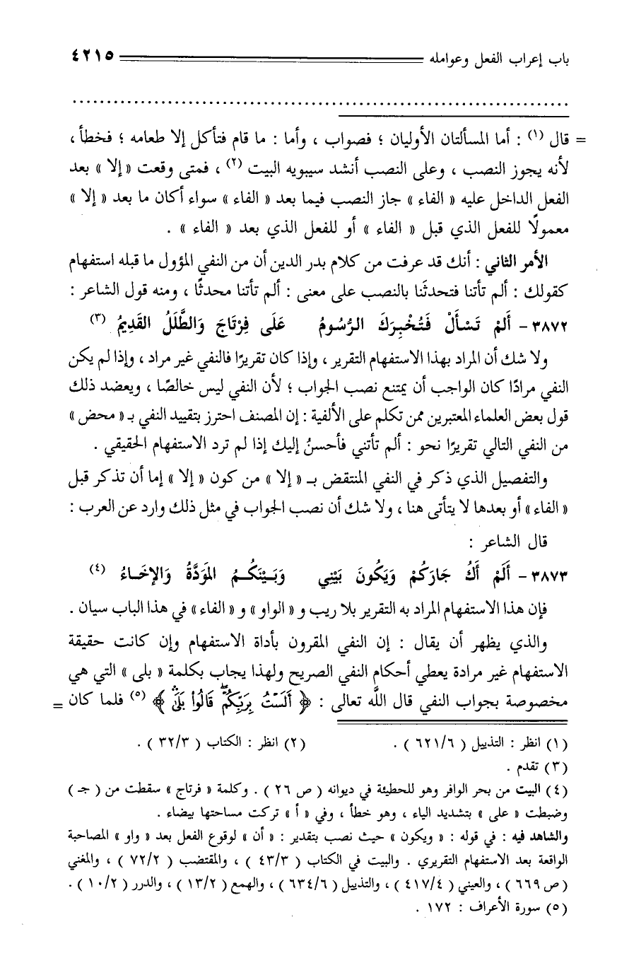 ولا شك أن المراد بهذا الاستفهام التقرير، وإذا كان تقريرا فالنفي غير مراد، وإذا لم يكن النفي مرادا كان الواجب أن يمتنع نصب الجواب؛ لأن النفي ليس خالصا، ويعضد ذلك قول بعض العلماء المعتبرين ممن تكلم على الألفية: إن المصنف احترز بتقييد النفي بـ «محض» من النفي التالي تقريرا نحو: ألم تأتني فأحسن إليك إذا لم ترد الاستفهام الحقيقي.