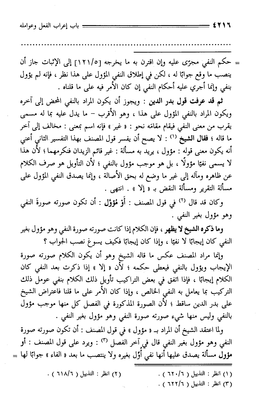 حكم النفي مجرى عليه وإن اقترن به ما يخرجه [5/ 121] إلى الإثبات جاز أن ينصب ما وقع جوابا له، لكن في إطلاق النفي المؤول على هذا نظر، فإنه لم يؤول بنفي وإنما أجري عليه أحكام النفي إن كان الأمر فيه على ما قلناه.