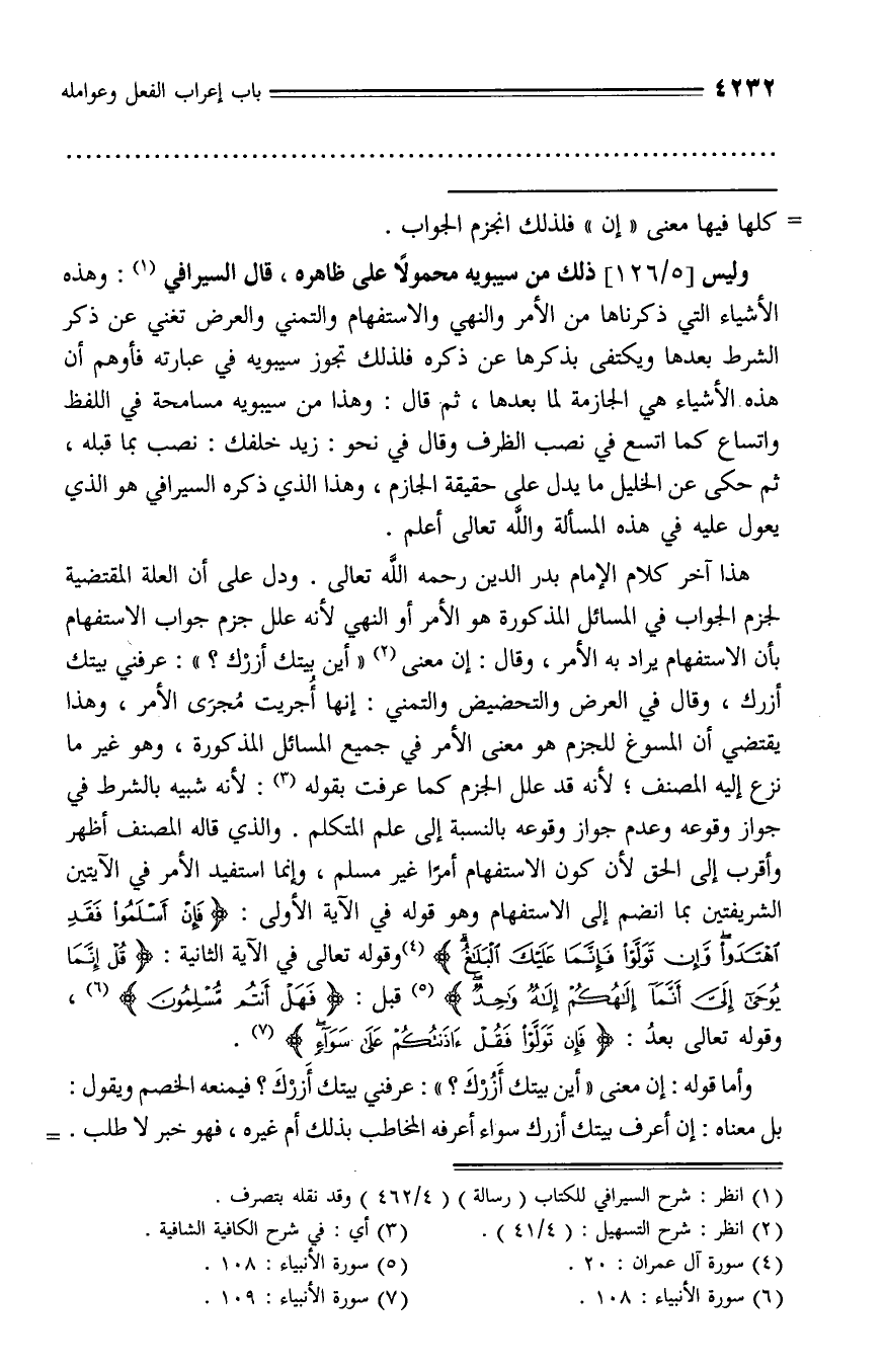 هذا آخر كلام الإمام بدر الدين رحمه الله تعالى. ودل على أن العلة المقتضية لجزم الجواب في المسائل المذكورة هو الأمر أو النهي لأنه علل جزم جواب الاستفهام بأن الاستفهام يراد به الأمر، وقال: إن معنى (¬2) «أين بيتك أزرك؟»: عرفني بيتك أزرك، وقال في العرض والتحضيض والتمني: إنها أجريت مجرى الأمر، وهذا يقتضي أن المسوغ للجزم هو معنى الأمر في جميع المسائل المذكورة، وهو غير ما نزع إليه المصنف؛ لأنه قد علل الجزم كما عرفت بقوله (¬3): لأنه شبيه بالشرط في جواز وقوعه وعدم جواز وقوعه بالنسبة إلى علم المتكلم. والذي قاله المصنف أظهر وأقرب إلى الحق لأن كون الاستفهام أمرا غير مسلم، وإنما استفيد الأمر في الآيتين الشريفتين بما انضم إلى الاستفهام وهو قوله في الآية الأولى: فَإِنْ أَسْلَمُوا فَقَدِ اهْتَدَوْا وَإِنْ تَوَلَّوْا فَإِنَّما عَلَيْكَ الْبَلاغُ (¬4) وقوله تعالى في الآية الثانية: قُلْ إِنَّما يُوحى إِلَيَّ أَنَّما إِلهُكُمْ إِلهٌ واحِدٌ (¬5) قبل: فَهَلْ أَنْتُمْ مُسْلِمُونَ (¬6)، وقوله تعالى بعد: فَإِنْ تَوَلَّوْا فَقُلْ آذَنْتُكُمْ عَلى سَواءٍ (¬7).