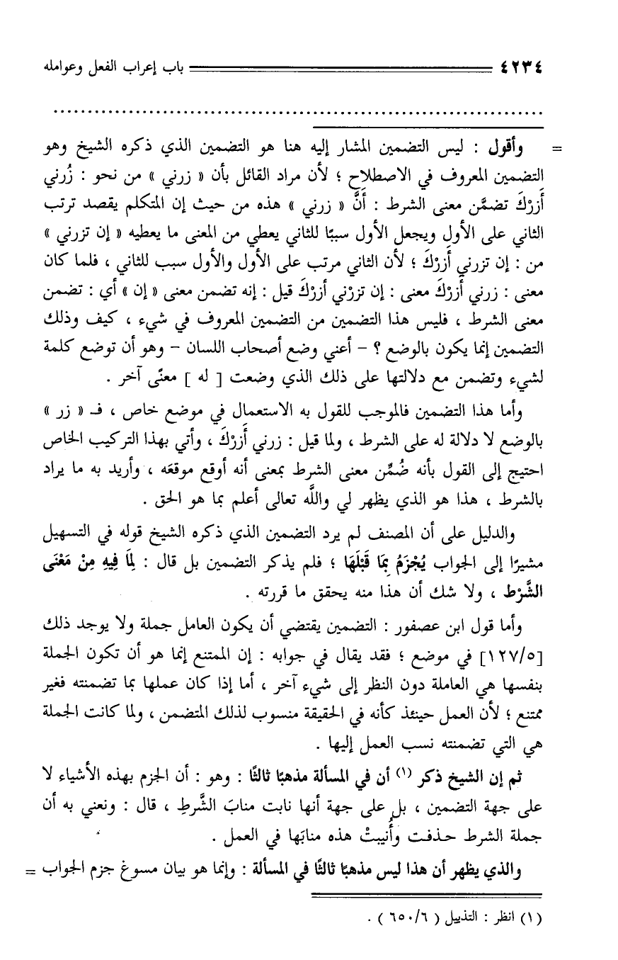 وأقول: ليس التضمين المشار إليه هنا هو التضمين الذي ذكره الشيخ وهو التضمين المعروف في الاصطلاح؛ لأن مراد القائل بأن «زرني» من نحو: زرني أزرك تضمّن معنى الشرط: أنّ «زرني» هذه من حيث إن المتكلم يقصد ترتب الثاني على الأول ويجعل الأول سببا للثاني يعطي من المعنى ما يعطيه «إن تزرني» من: إن تزرني أزرك؛ لأن الثاني مرتب على الأول والأول سبب للثاني، فلما كان معنى: زرني أزرك معنى: إن تزرني أزرك قيل: إنه تضمن معنى «إن» أي: تضمن معنى الشرط، فليس هذا التضمين من التضمين المعروف في شيء، كيف وذلك التضمين إنما يكون بالوضع؟ - أعني وضع أصحاب اللسان - وهو أن توضع كلمة لشيء وتضمن مع دلالتها على ذلك الذي وضعت [له] معنى آخر.