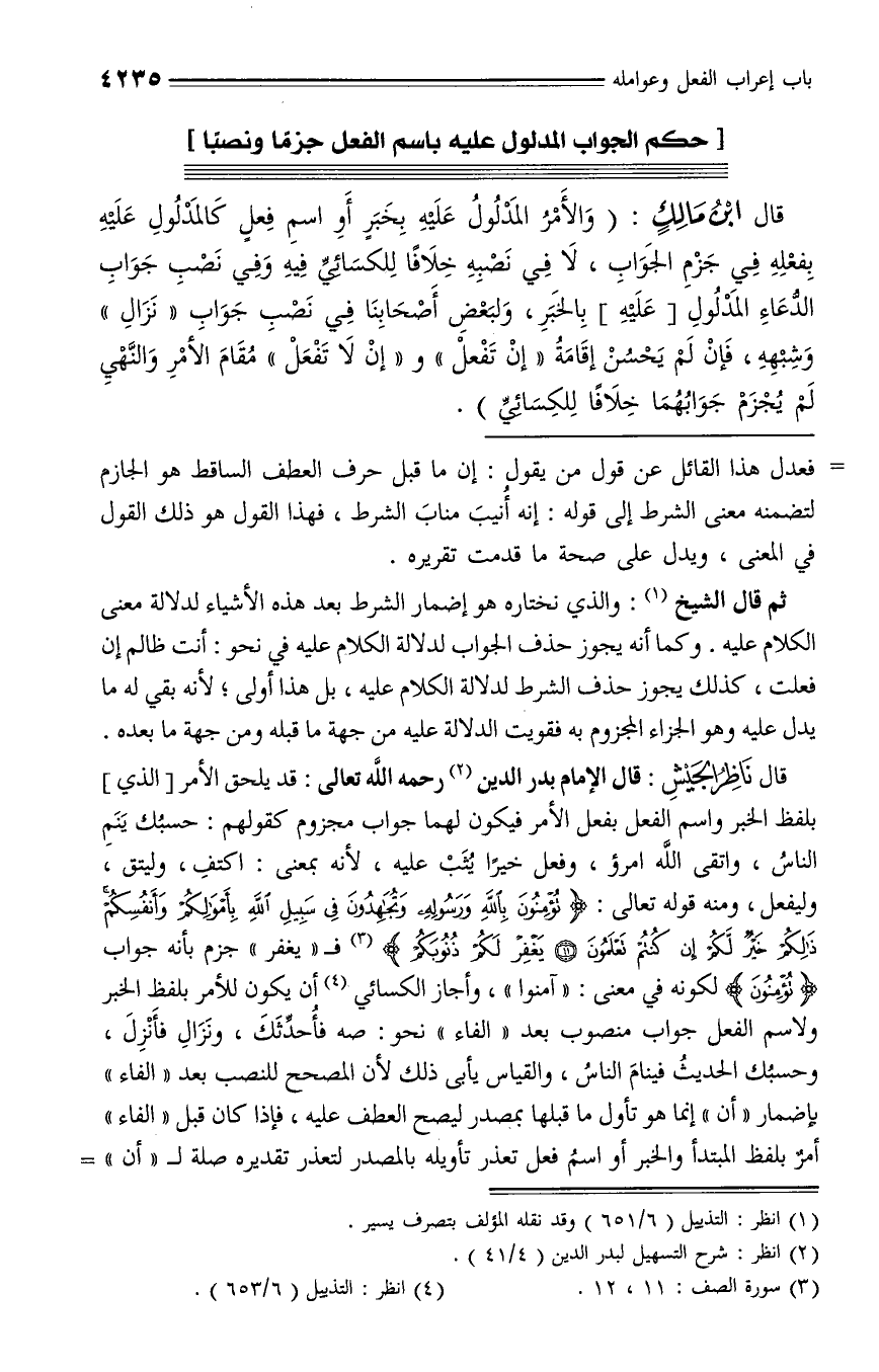قال ناظر الجيش: قال الإمام بدر الدين (¬2) رحمه الله تعالى: قد يلحق الأمر [الذي] بلفظ الخبر واسم الفعل بفعل الأمر فيكون لهما جواب مجزوم كقولهم: حسبك ينم الناس، واتقى الله امرؤ، وفعل خيرا يثب عليه، لأنه بمعنى: اكتف، وليتق، وليفعل، ومنه قوله تعالى: تُؤْمِنُونَ بِاللَّهِ وَرَسُولِهِ وَتُجاهِدُونَ فِي سَبِيلِ اللَّهِ بِأَمْوالِكُمْ وَأَنْفُسِكُمْ ذلِكُمْ خَيْرٌ لَكُمْ إِنْ كُنْتُمْ تَعْلَمُونَ (11) يَغْفِرْ لَكُمْ ذُنُوبَكُمْ (¬3) فـ «يغفر» جزم بأنه جواب تُؤْمِنُونَ لكونه في معنى: «آمنوا»، وأجاز الكسائي (¬4) أن يكون للأمر بلفظ الخبر ولاسم الفعل جواب منصوب بعد «الفاء» نحو: صه فأحدّثك، ونزال فأنزل، وحسبك الحديث فينام الناس، والقياس يأبى ذلك لأن المصحح للنصب بعد «الفاء» بإضمار «أن» إنما هو تأول ما قبلها بمصدر ليصح العطف عليه، فإذا كان قبل «الفاء» أمر بلفظ المبتدأ والخبر أو اسم فعل تعذر تأويله بالمصدر لتعذر تقديره صلة لـ «أن» -