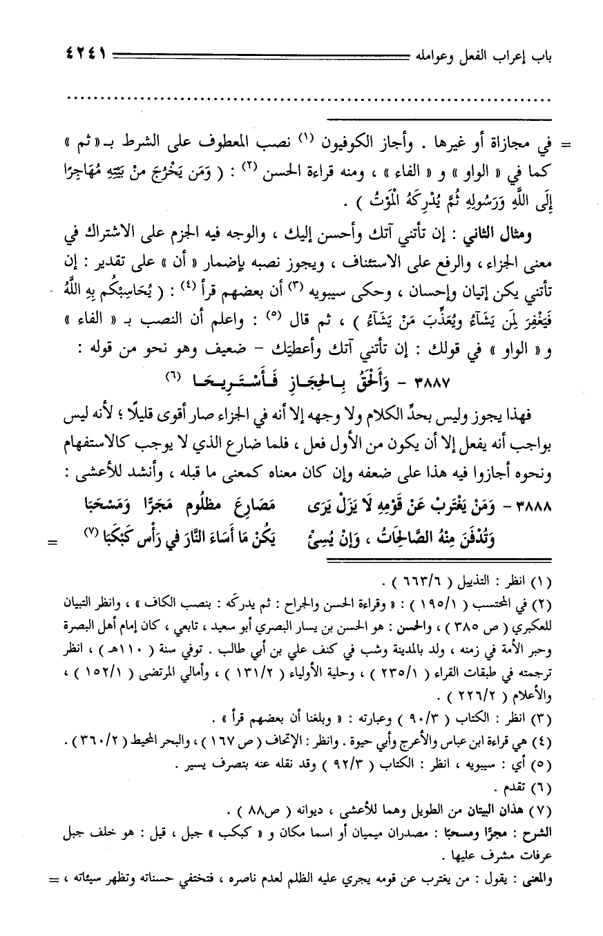 ومثال الثاني: إن تأتني آتك وأحسن إليك، والوجه فيه الجزم على الاشتراك في معنى الجزاء، والرفع على الاستئناف، ويجوز نصبه بإضمار «أن» على تقدير: إن تأتني يكن إتيان وإحسان، وحكى سيبويه (¬3) أن بعضهم قرأ (¬4): (يحاسبكم به الله فيغفر لمن يشآء ويعذّب من يشآء)، ثم قال (¬5): واعلم أن النصب بـ «الفاء» و «الواو» في قولك: إن تأتني آتك وأعطيك - ضعيف وهو نحو من قوله: