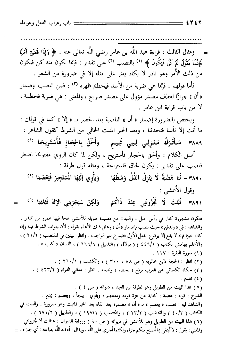 ومثال الثالث: قراءة عبد الله بن عامر رضي الله تعالى عنه: وإذا قضى أمرا فإنما يقول له كن فيكون (¬1) بالنصب (¬2) على تقدير: فإنما يكون منه كن فيكون من ذلك الأمر وهو نادر لا يكاد يعثر على مثله إلا في ضرورة من الشعر.