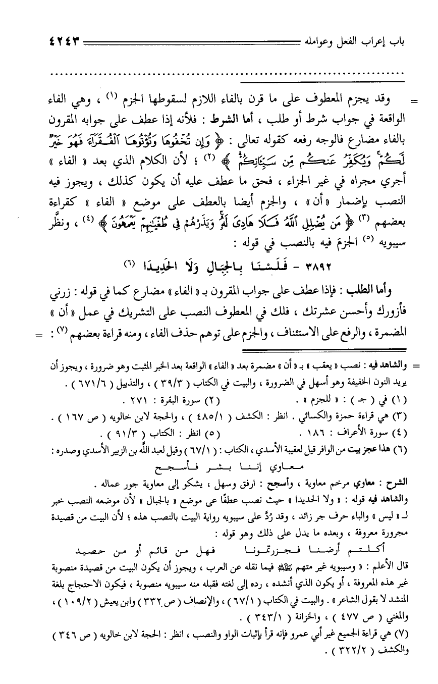 وقد يجزم المعطوف على ما قرن بالفاء اللازم لسقوطها الجزم (¬1)، وهي الفاء الواقعة في جواب شرط أو طلب، أما الشرط: فلأنه إذا عطف على جوابه المقرون بالفاء مضارع فالوجه رفعه كقوله تعالى: وَإِنْ تُخْفُوها وَتُؤْتُوهَا الْفُقَراءَ فَهُوَ خَيْرٌ لَكُمْ وَيُكَفِّرُ عَنْكُمْ مِنْ سَيِّئاتِكُمْ (¬2)؛ لأن الكلام الذي بعد «الفاء» أجري مجراه في غير الجزاء، فحق ما عطف عليه أن يكون كذلك، ويجوز فيه النصب بإضمار «أن»، والجزم أيضا بالعطف على موضع «الفاء» كقراءة بعضهم (¬3) من يضلل الله فلا هادى له ويذرهم في طغيانهم يعمهون (¬4)، ونظّر سيبويه (¬5) الجزم فيه بالنصب في قوله: