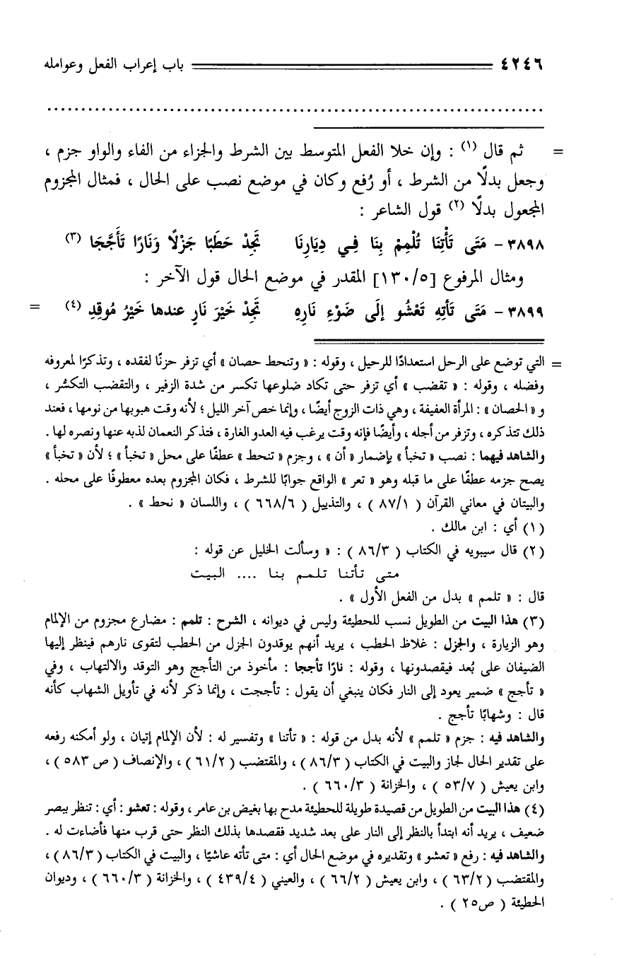 (¬3) هذا البيت من الطويل نسب للحطيئة وليس في ديوانه، الشرح: تلمم: مضارع مجزوم من الإلمام وهو الزيارة، والجزل: غلاظ الحطب، يريد أنهم يوقدون الجزل من الحطب لتقوى نارهم فينظر إليها الضيفان على بعد فيقصدونها، وقوله: نارا تأججا: مأخوذ من التأجج وهو التوقد والالتهاب، وفي «تأجج» ضمير يعود إلى النار فكان ينبغي أن يقول: تأججت، وإنما ذكر لأنه في تأويل الشهاب كأنه قال: وشهابا تأجج.