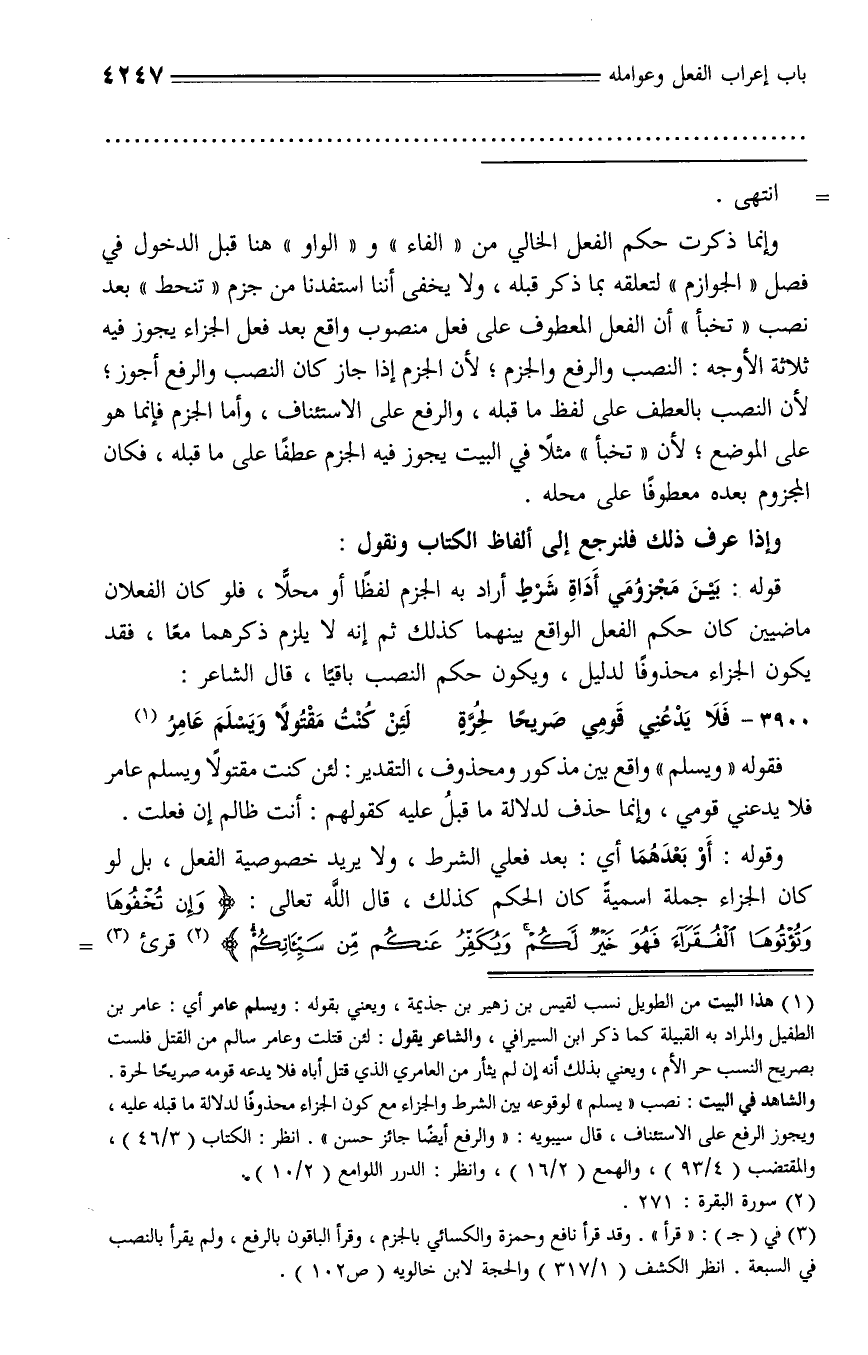 وإنما ذكرت حكم الفعل الخالي من «الفاء» و «الواو» هنا قبل الدخول في فصل «الجوازم» لتعلقه بما ذكر قبله، ولا يخفى أننا استفدنا من جزم «تنحط» بعد نصب «تخبأ» أن الفعل المعطوف على فعل منصوب واقع بعد فعل الجزاء يجوز فيه ثلاثة الأوجه: النصب والرفع والجزم؛ لأن الجزم إذا جاز كان النصب والرفع أجوز؛ لأن النصب بالعطف على لفظ ما قبله، والرفع على الاستئناف، وأما الجزم فإنما هو على الموضع؛ لأن «تخبأ» مثلا في البيت يجوز فيه الجزم عطفا على ما قبله، فكان المجزوم بعده معطوفا على محله.