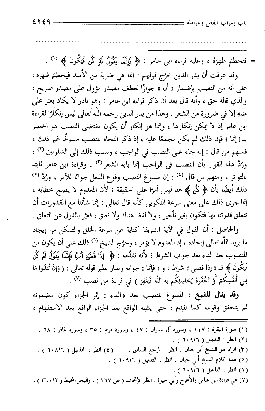وقد عرفت أن بدر الدين خرّج قولهم: إنما هي ضربة من الأسد فيحطم ظهره، على أنه من النصب بإضمار «أن» جوازا لعطف مصدر مؤول على مصدر صريح، والذي قاله حق، وأنه قال بعد أن ذكر قراءة ابن عامر: وهو نادر لا يكاد يعثر على مثله إلا في ضرورة من الشعر. وهذا من بدر الدين رحمه الله تعالى ليس إنكارا لقراءة ابن عامر إذ لا يمكن إنكارها، وإنما هو إنكار أن يكون مقتضى النصب هو الحصر بـ «إنما» فإن ذلك لم يكن مجمعا عليه، إذ ذكر النحاة للنصب مسوغا غير ذلك، فمنهم من قال: إنه جاء على النصب في الواجب، ونسب ذلك إلى الشلوبين (¬2)، وردّ هذا القول بأن النصب في الواجب إنما بابه الشعر (¬3). وقراءة ابن عامر ثابتة بالتواتر، ومنهم من قال (¬4): إن مسوغ النصب وقوع الفعل جوابا للأمر، وردّ (¬5) ذلك أيضا بأن كُنْ هنا ليس أمرا على الحقيقة؛ لأن المعدوم لا يصح خطابه، إنما جرى ذلك على معنى سرعة التكوين كأنه قال تعالى: إنما شأننا مع المقدورات أن تتعلق قدرتنا بها فتكون بغير تأخير، ولا لفظ هناك ولا نطق، فعبّر بالقول عن التعلق.