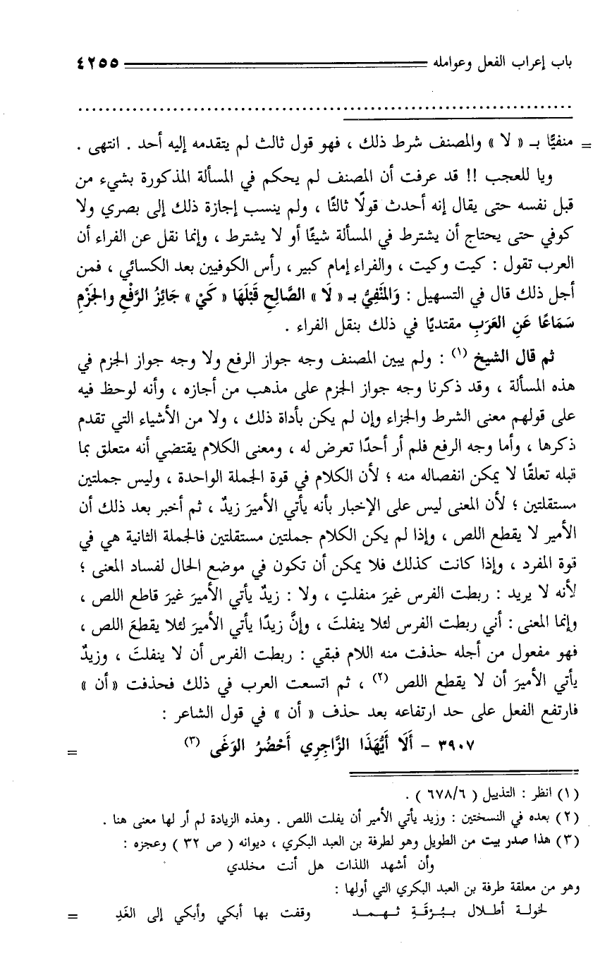 ويا للعجب!! قد عرفت أن المصنف لم يحكم في المسألة المذكورة بشيء من قبل نفسه حتى يقال إنه أحدث قولا ثالثا، ولم ينسب إجازة ذلك إلى بصري ولا كوفي حتى يحتاج أن يشترط في المسألة شيئا أو لا يشترط، وإنما نقل عن الفراء أن العرب تقول: كيت وكيت، والفراء إمام كبير، رأس الكوفيين بعد الكسائي، فمن أجل ذلك قال في التسهيل: والمنفيّ بـ «لا» الصّالح قبلها «كي» جائز الرّفع والجزم سماعا عن العرب مقتديا في ذلك بنقل الفراء.